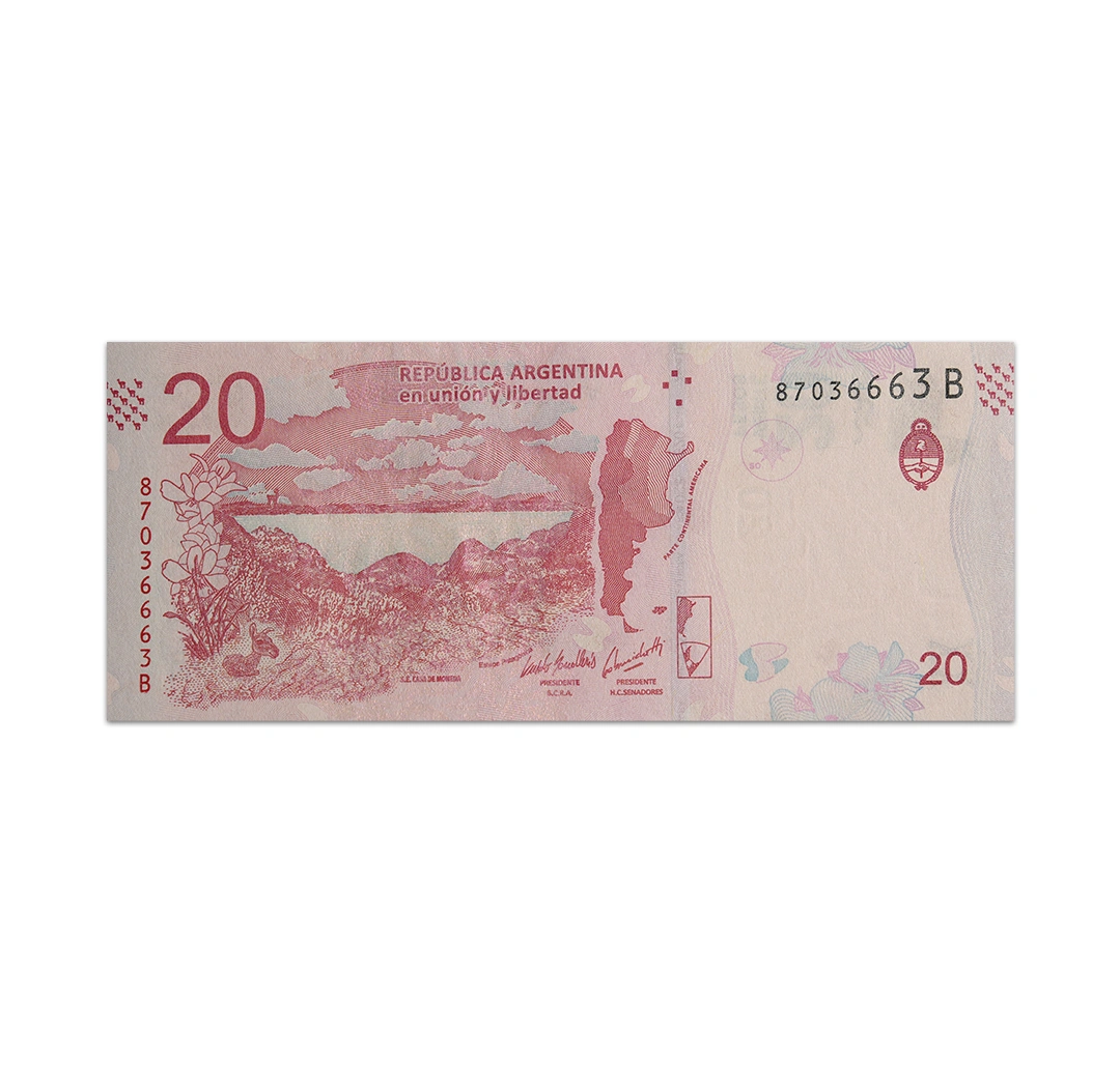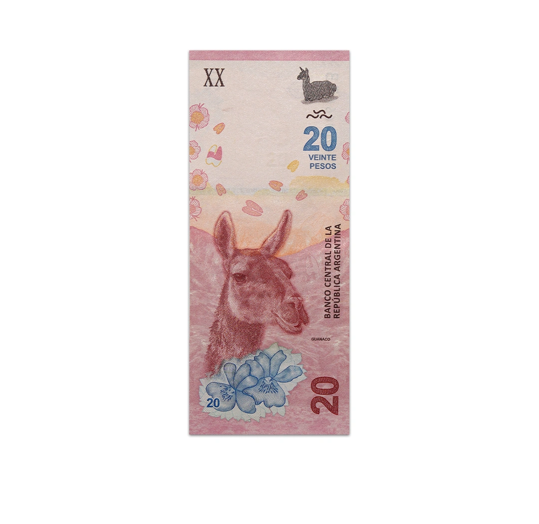 This uncirculated 20 Argentinian peso note was issued in 2017 by the Central Bank of the Republic of Argentina as part of the Wildlife series. It has a red and orange color scheme and bears the signatures of Guido Sandleris and Gabriella Michetti. Its obverse side features a guanaco, a llama-like camelid that is native to South America. Its reverse side shows a view of the Patagonian Desert and a map of the Argentine Sea, Antarctica, and the South Atlantic Islands. Security features of the note include a color-shifting windowed security thread, a flower petal registration device, and a watermark of a guanaco with an electrotype 20. Its dimensions are 155 mm x 65 mm.