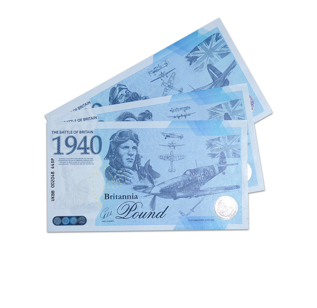 A tribute to the heroic efforts and the iconic aircraft that played a vital role in securing victory in the Battle of Britain. Each banknote features one iconic aircraft on the front and alle three notes have the same backside featuring all three aircraft.