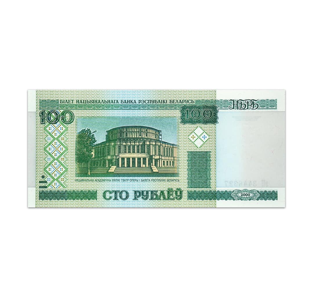 The Belarus 100 Rublei Banknote issued in 2000 measures 150 x 69 mm in length and width. Its obverse side prominently displays the National Academic Great Opera and Ballet House building in Minsk. On the reverse side, a captivating scene from the ballet performance titled Vibrannitsa by composer Evgeni A. Glebov is featured. To enhance security measures, the note includes a solid security thread printed with a 4-letter Russian alphabet. Additionally, under UV light, an image of a ballerina en pointe becomes visible, further ensuring authenticity.
