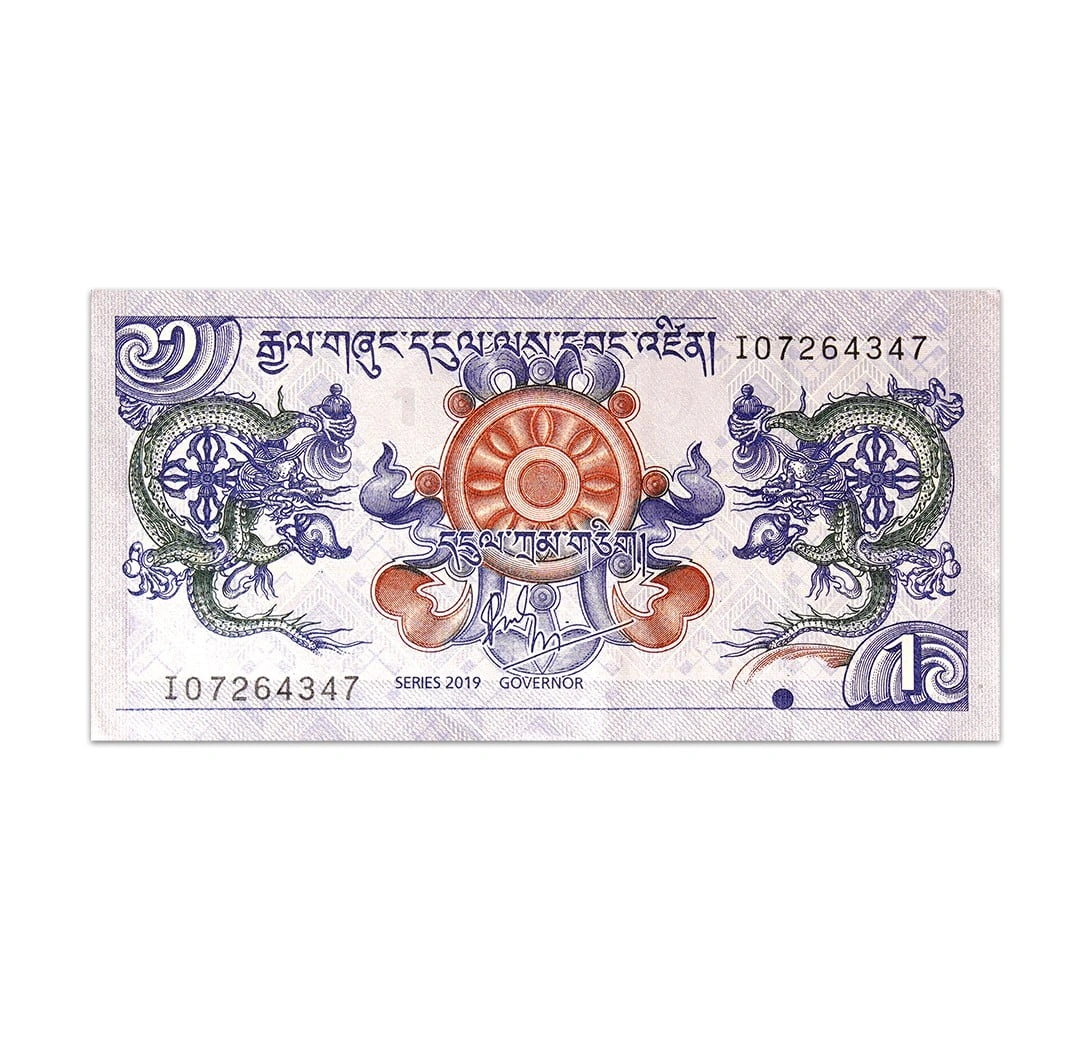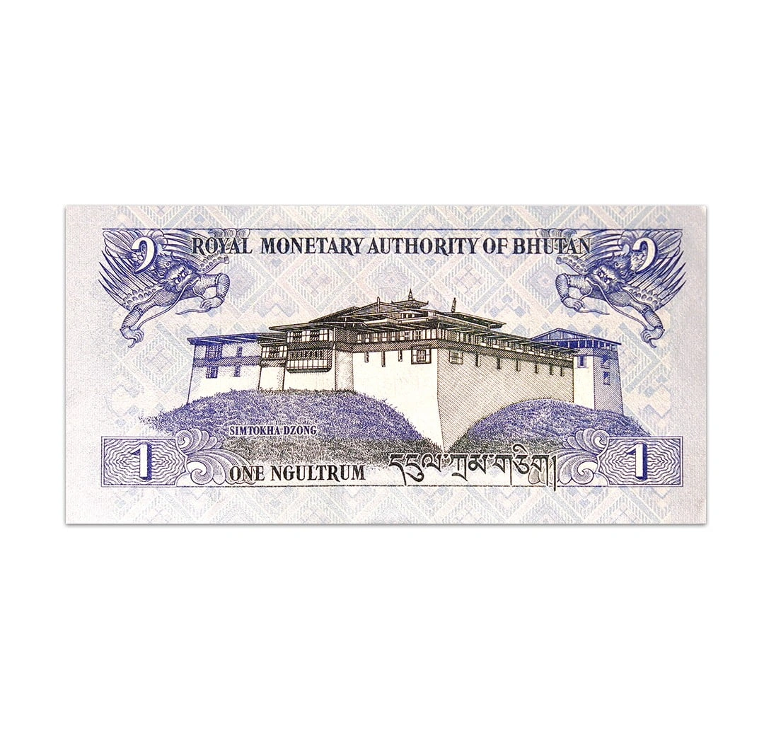 The Bhutan 1 Ngultrum is part of the family of banknotes issued in 2013 with a pick number P-27b. This replacement banknote comes in uncirculated condition. The obverse depicts dragons and the Khorlo or the Wheel of Dharma which is a symbol of good luck. On the banknotes reverse side is the Simtokha Dzong which was a Buddhist monastery. The banknote which is made of a hybrid composite substrate is 120 x 60 mm in size. It has no security thread and watermark.