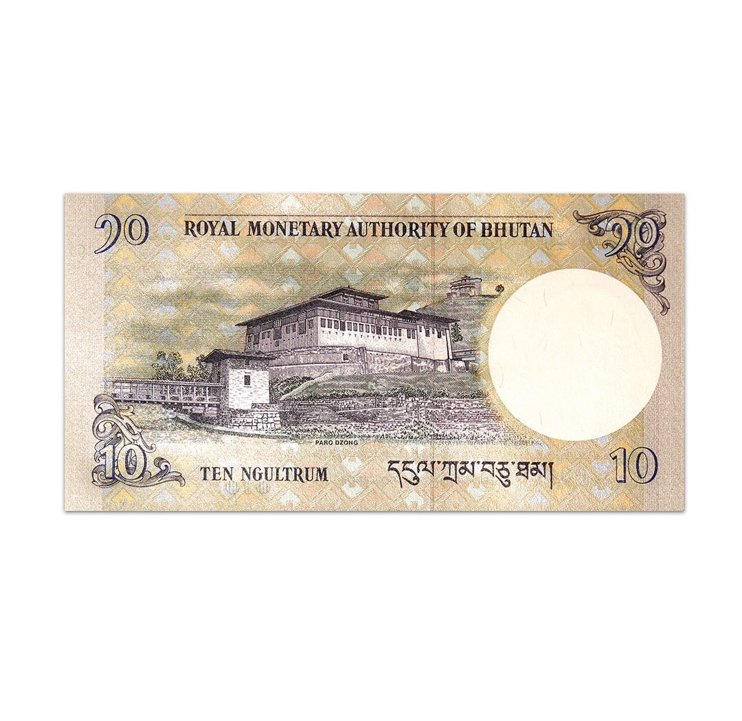 The Bhutan 10 Ngultrum is part of the family of banknotes issued in 2013 with a pick number P-29bz. This replacement banknote comes in uncirculated condition. Its obverse features Jigme Singye Wangchuck who was the 4th king of Bhutan. On the fronts center is a Dungkar or a conch which is one of the eight symbols of good luck. The reverse of the banknote is the Buddhist Monastery and Fortress Paro Rinpung Dzong. The 125 x 65 mm banknote is made of a hybrid composite substrate and bears a solid security thread. Furthermore, it has a watermark that depicts Jigme Singye Wangchuck.