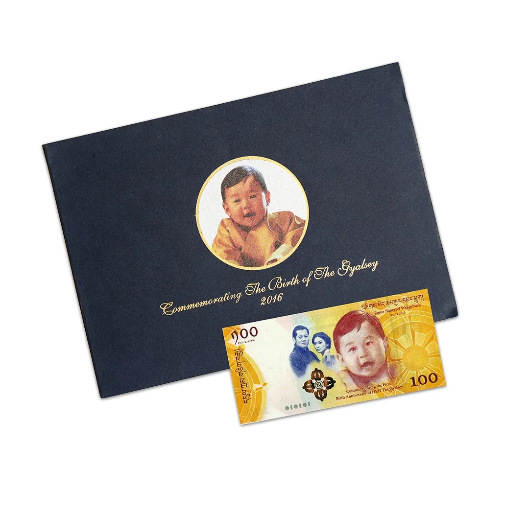 The Royal Monetary Authority of Bhutan will be commemorating the first birthday of His Royal Highness the Gyalsey, Jigme Namgyel Wangchuck, born on February 5th, 2016. As part of the celebration, a special commemorative banknote with a denomination of Nu. 100 will be unveiled. Additionally, the note comes with a commemorative folder-card.
