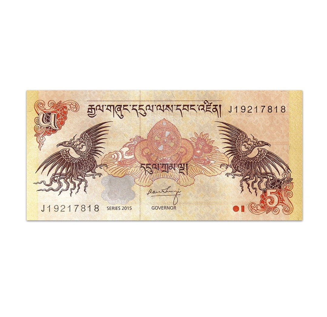 The Bhutan 5 Ngultrum is part of the family of notes designed by Giesecke & Devrient. This series of notes uses Louisenthals Hybrid which is composed of paper and polymer substrate. This particular Bhutan 5 Ngultrum is in uncirculated condition. Its obverse side features a DeyNga and sensory enjoyment offerings at the center. On each side is a bja tshering which is a mythical bird that brings about long life. It also shows an embossed cloverleaf. The back of the note displays the Paro Taktsang which is known as the Taktsang Palphug Monastery or the Tigers Nest. This 125 x 60 mm paper note comes with a solid security thread and signed by Tenzin.