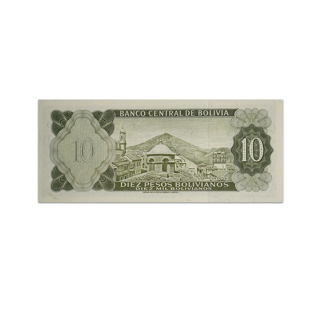 The Bolivia 10 Pesos Bolivianos - 10,000 Bolivianos banknote is part of the family of notes issued by the Central Bank of Bolivia in 1962. It is predominantly green with hints of yellow and purple. Featured on its front design is the national emblem and a portrait of German Busch Becerra who was the countrys 41st and 43rd president. The back of the banknote reflects the Villa Imperial buildings located in Potosi. The Cerro de Potosi or the Potosi Mountain is also shown in the background. Printed by Thomas De La Rue & Company, Limited, the 158 x 66 mm paper bill bears a solid security thread with printed BOLIVIA. This Bolivia 10 Pesos Bolivianos - 10,000 Bolivianos banknote is in uncirculated condition.