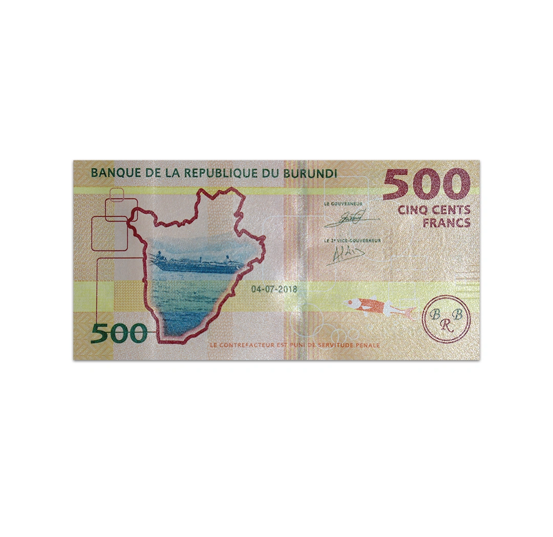 The Burundi 500 Francs Banknote is part of the 2015 - 2018 Issues. It is orange in color and measures 120 x 60 mm. The obverse side shows a fish as a registration device, a crocodile, the coat of arms, a coffee plant branch with berries, a flag, a cattle head below latent BRB. The reverse side features Burundi's map outline, a boat on the water, a fish, and a bank logo. It also bears a pearlescent stripe on the front with a vertical 500. This banknote contains a windowed holographic security thread with demetalized head of heifer, stars, and BRB. It uses a watermark with Prince Louis Rwagasore and electrotype BRB design.