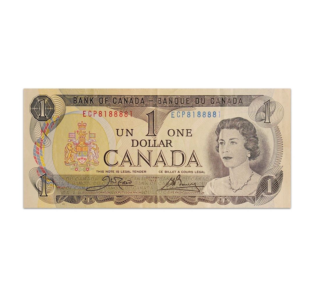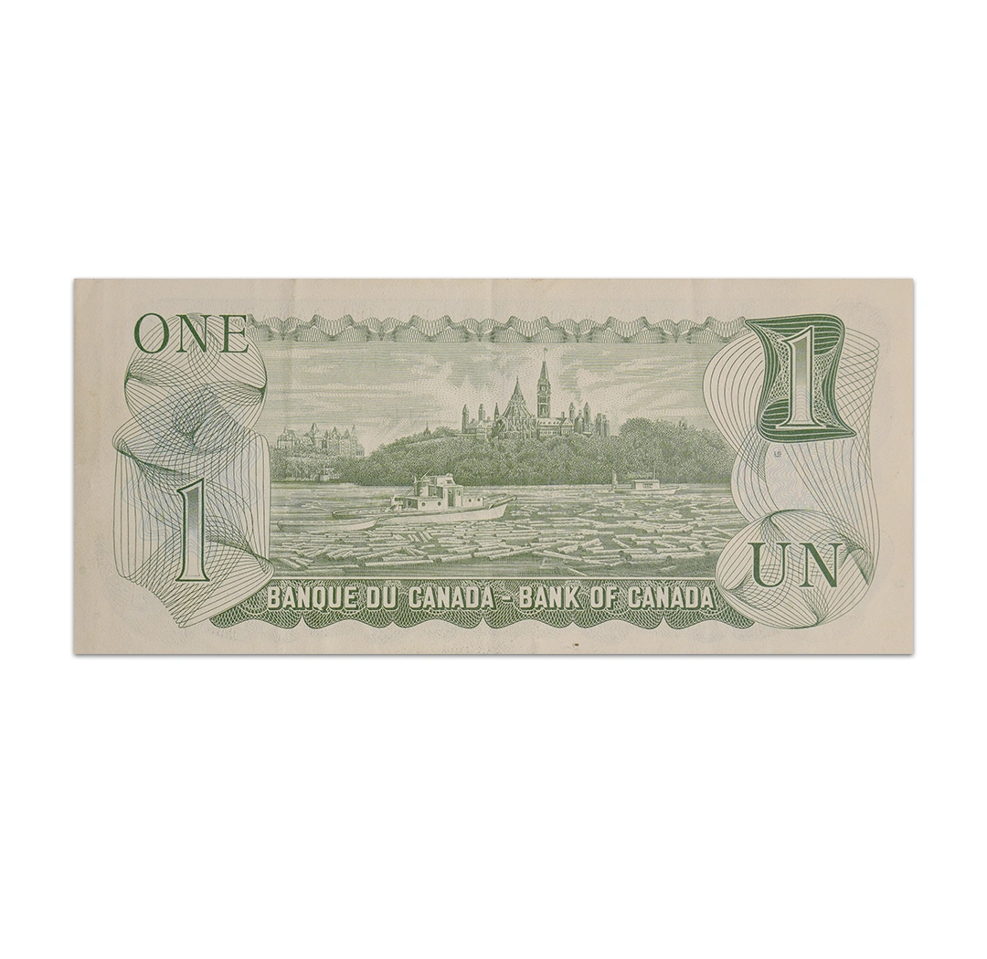 This AUNC Canadian dollar banknote is part of the multicolored Scenes of Canada family that used rainbow printing as an anti-counterfeiting measure. The note is dated 1973 and signed by Bank of Canada Deputy Governor John William Crow and Governor Gerald Keith Bouey. It has green, yellow, red, blue, and black colors and dimensions of 152 mm by 70 mm. Its front side features a colored coat of arms and Anthony Buckleys picture of Queen Elizabeth II. Its reverse side features a view of the Parliament Buildings and the Ottawa River. The note does not have a security thread nor a watermark. It was demonetized in 2021.