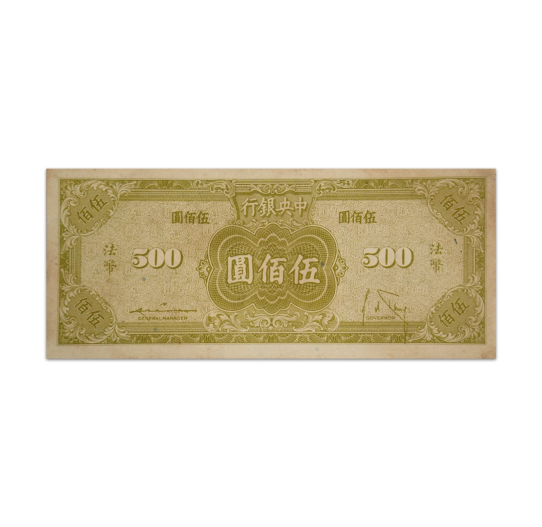 The Central Bank of China 500 Yuan note from 1945 (Republic of China year 34) is a historical banknote from the Republic of China era (1912-1948), featuring. These notes, often cataloged with Pick numbers like P#283a, are collectible items, known for variations in condition and printer, and depict portraits (often Sun Yat-sen) and Chinese text for "Central Bank" and "Five Hundred Yuan," reflecting wartime circulation and varying designs.