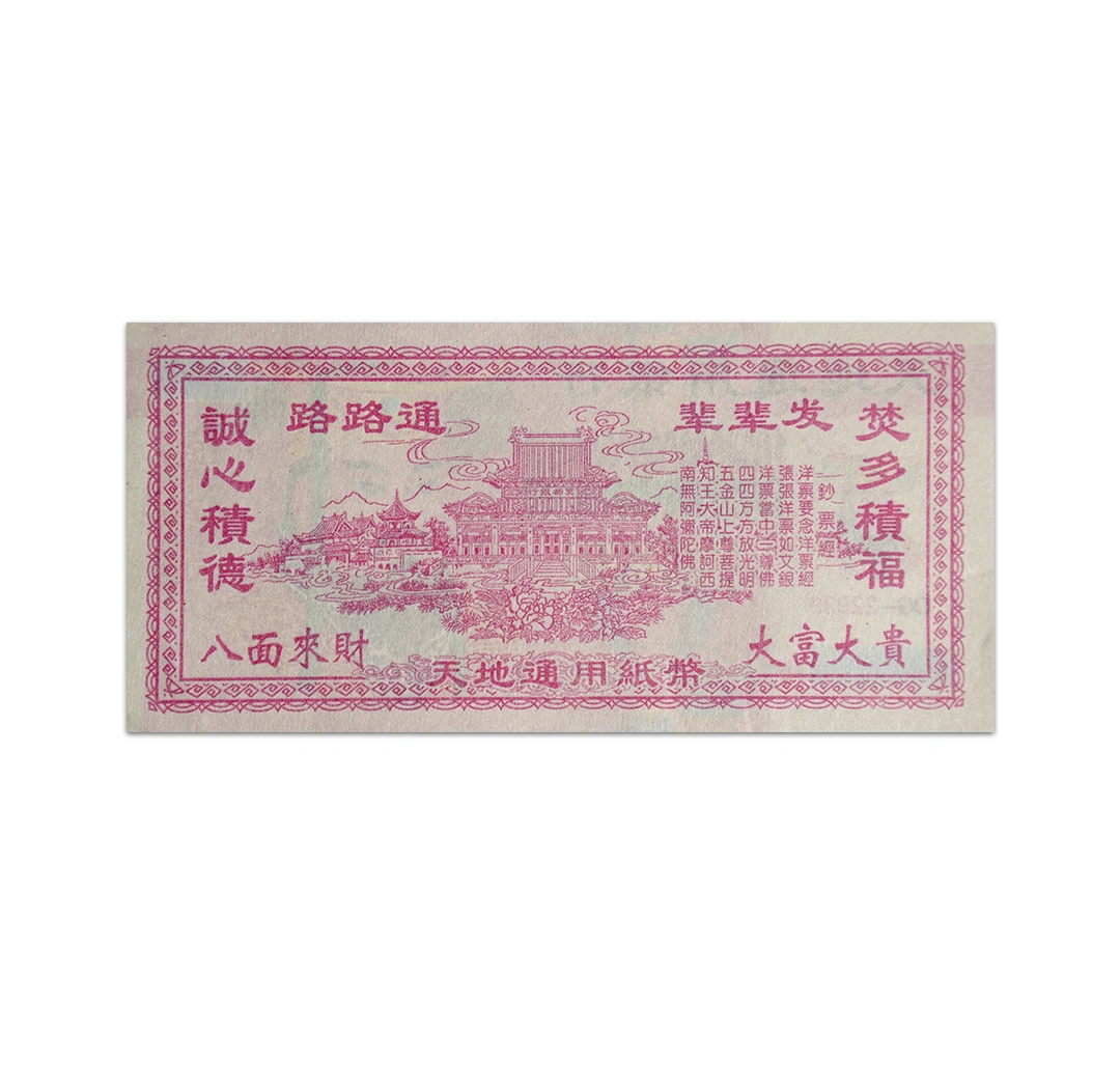 Chinese Hell Bank Notes, often referred to as Joss Paper, are traditional spirit money used in Chinese ancestral worship and funerary rites. These notes are symbolic currency offered to deceased ancestors to provide them with wealth and comfort in the afterlife. They are typically burned as a way to transmit the offerings to the spiritual world.\n