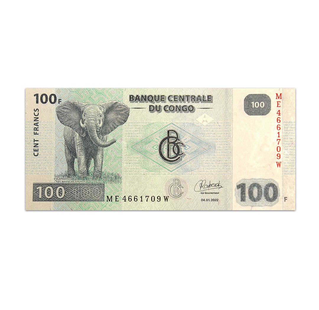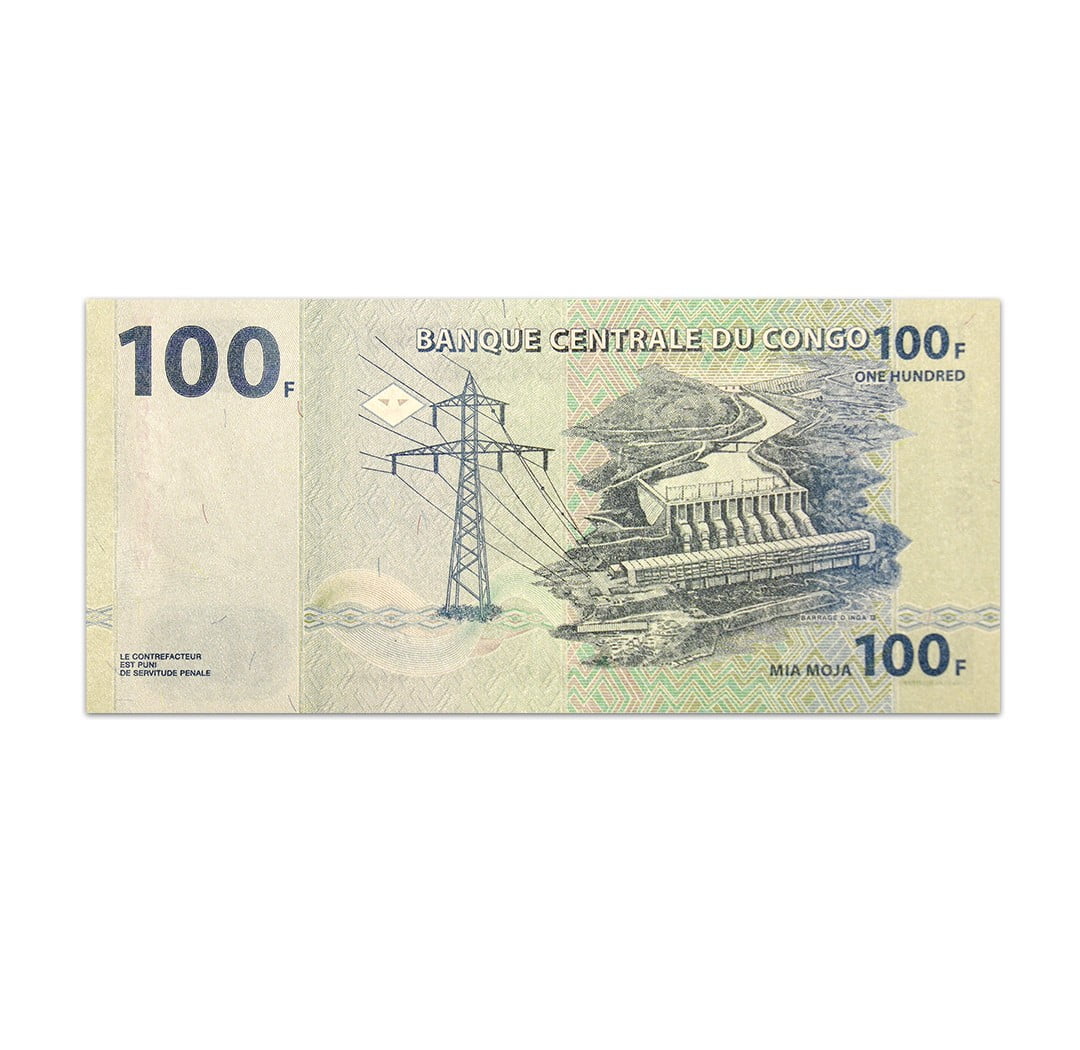 The Congo Democratic Republic 100 Franc banknote was issued by the Central Bank of Congo in 2022. The banknote comes in a combination of blue and green. Featured on its obverse are an elephant in the Virunga National Park and the bank monogram. The reverse of the paper bill depicts the Inga II hydroelectric dam on the Congo River. The paper bill bears a solid security thread with a demetalized REP DEM DU CONGO, a watermark that reflects the head of an Okapi or a Congolese giraffe, and a registration device in the form of a 5-pointed star in a diamond design. It is 150 x 70 mm in size and bears the signature of Malangu Kabedi Mbuyi. This particular banknote is in uncirculated condition.