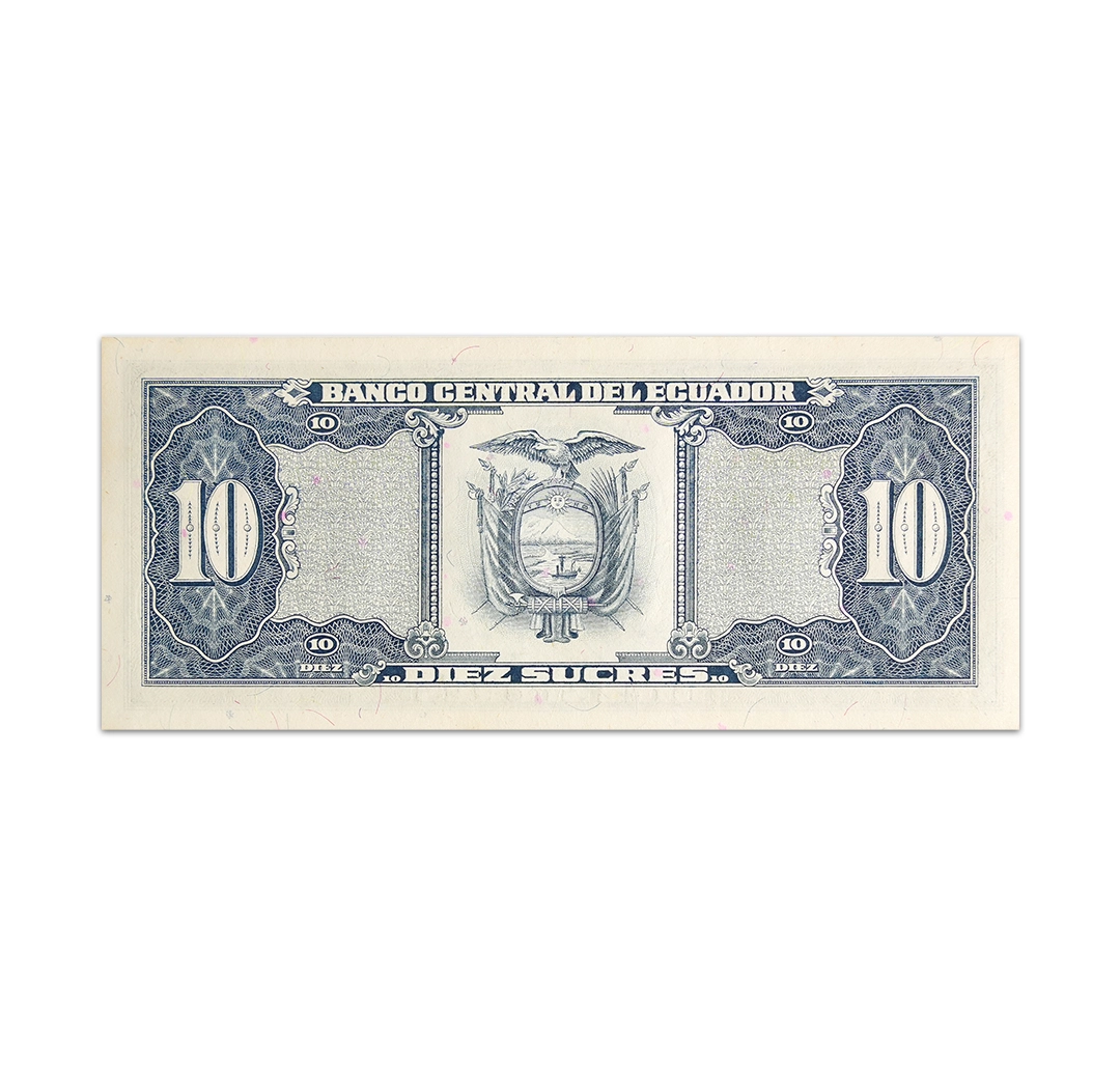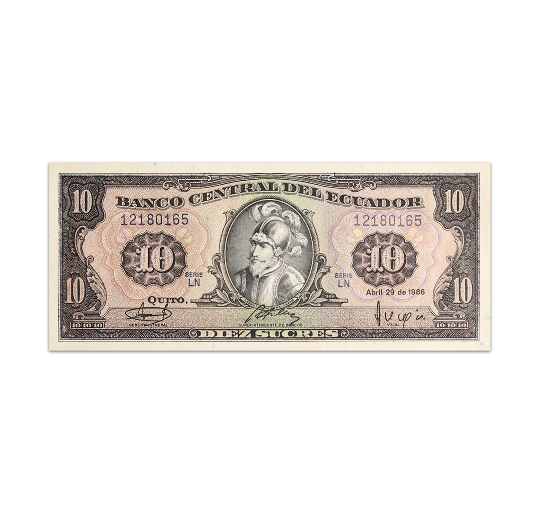 This uncirculated 10 Sucres Ecuador note is a standard circulation banknote issued by the Central Bank of Ecuador. It is a brown and green note that is dated 1986, bear the signatures of Carlos Julio Emanuel, Xavier Espinoza and Alfonso Trujillo Bustamante, and measures 155 × 66 mm. Its obverse side features Sebastian de Benalcazar. Its reverse side shows the coat of arms. The note does not have a security thread or watermark. Additionally, this particular banknote has pinholes and was demonetized.