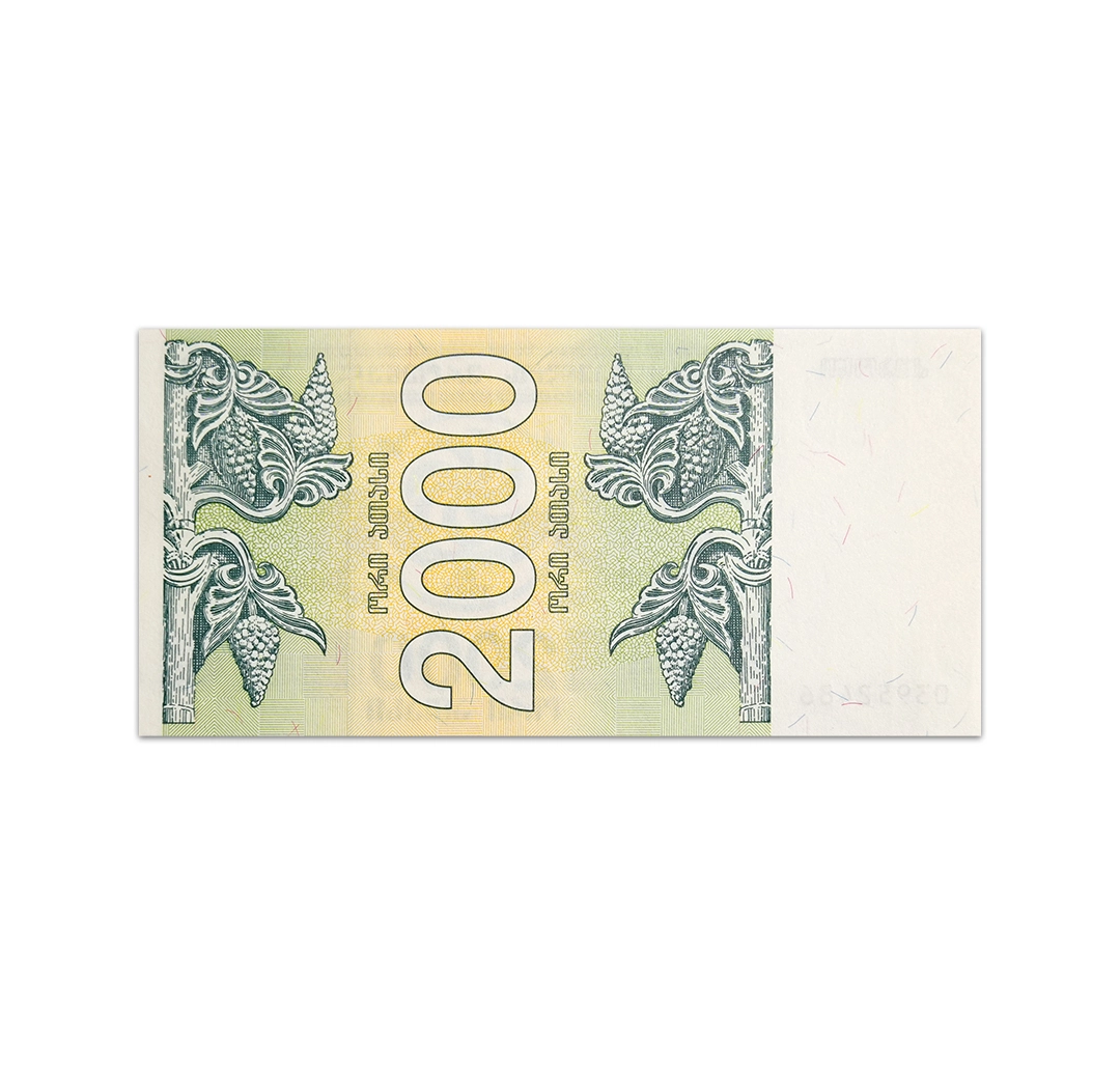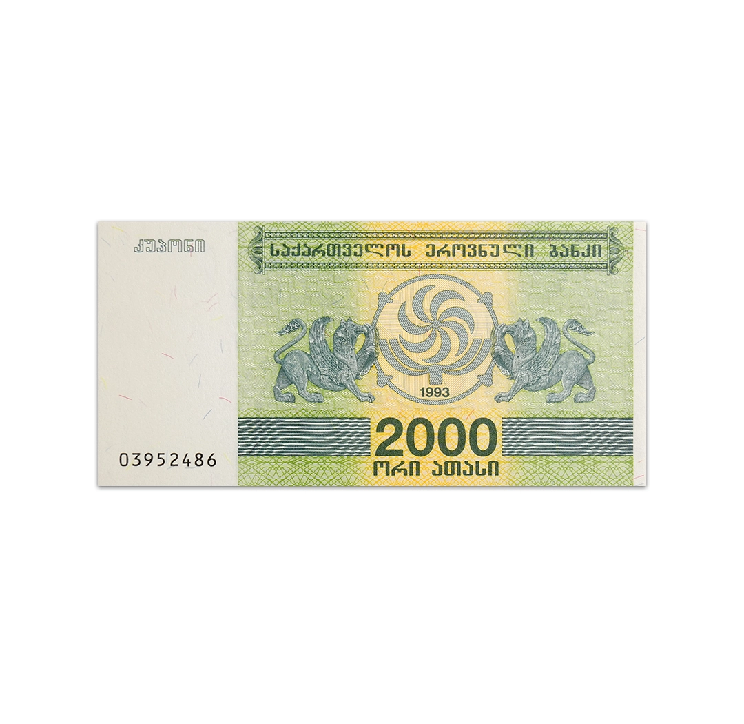 The Georgia 2,000 Lari banknote from 1993 bears exquisite carvings from the Samtavisi Cathedral. Its front design depicts a carving of griffin flanking a Borjgali, the symbol of the sun and tree of life. On the reverse is a well-crafted carving of a grapevine. The note was designed by Nodar and Bachana Malazonia and measures 115 x 55 mm. Its security features include a solid security thread and a rhombus pattern watermark.