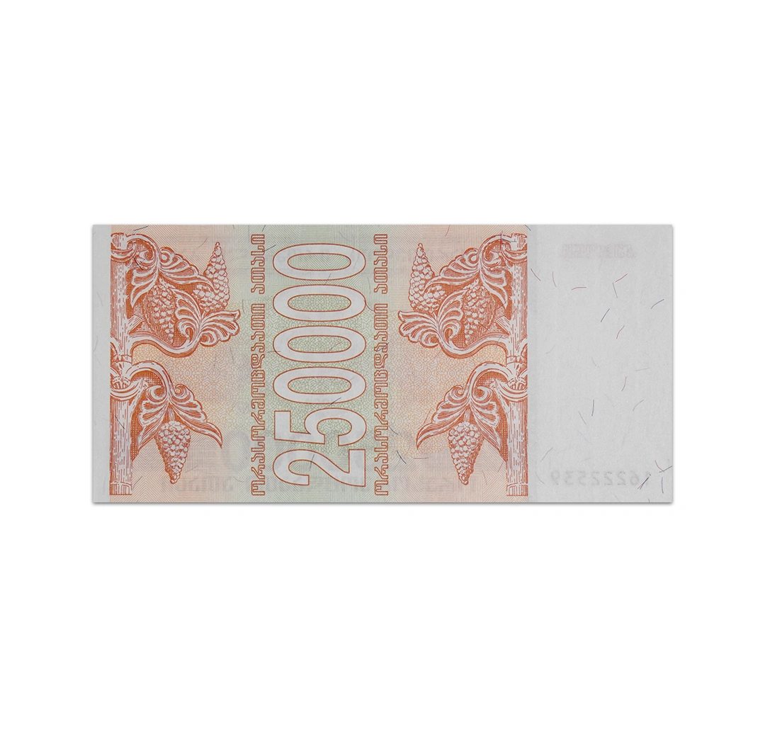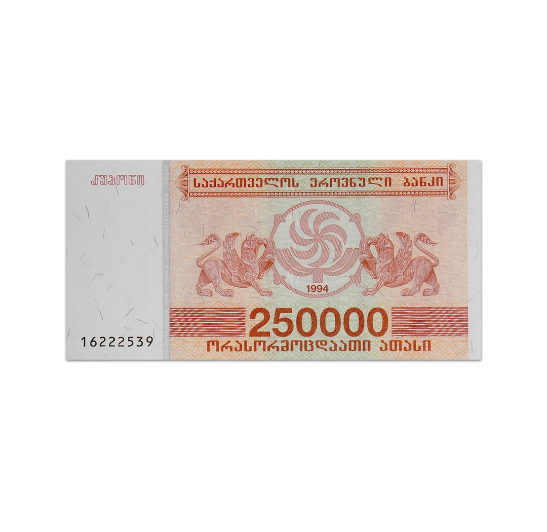 The Georgia 250,000 Kuponi banknote from the 1994 coupon series was designed by Nodar and Bachana Malazonia. It measures 115 x 55 mm and depicts ancient carvings found in the Samtavisi Cathedral. Its front design features a carving of a griffin flanking a Borjgali, the symbol of the sun and tree of life, and a vertical gray stripe at the right edge of the watermark area. At the back is a well-crafted carving of a grapevine. The note does not contain any security threads however when placed under a UV light, a watermark parallelogram pattern is visible.