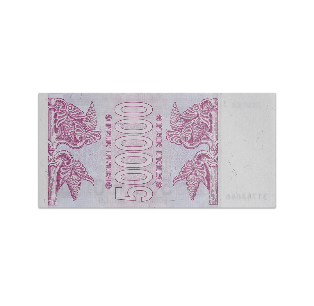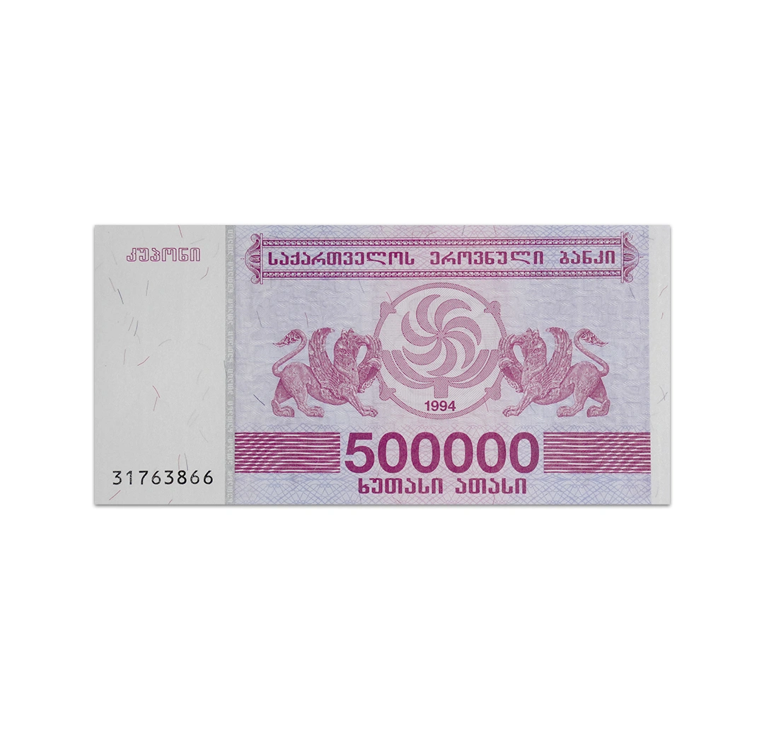 The Georgian 500,000 Lari banknote was issued in 1994 as part of the coupon series. It measures 115 x 55 mm and does not contain any security threads however placing the note under a UV light would reflect a parallelogram watermark pattern. The banknote's front design depicts a carving of a griffin from the Samtavisi Cathedral flanking a Borjgali, the symbol of the sun and tree of life, and a vertical gray stripe at the right edge of the watermark area. At the back is a delicate carving of a grapevine also found in the Samtavisi Cathedral.
