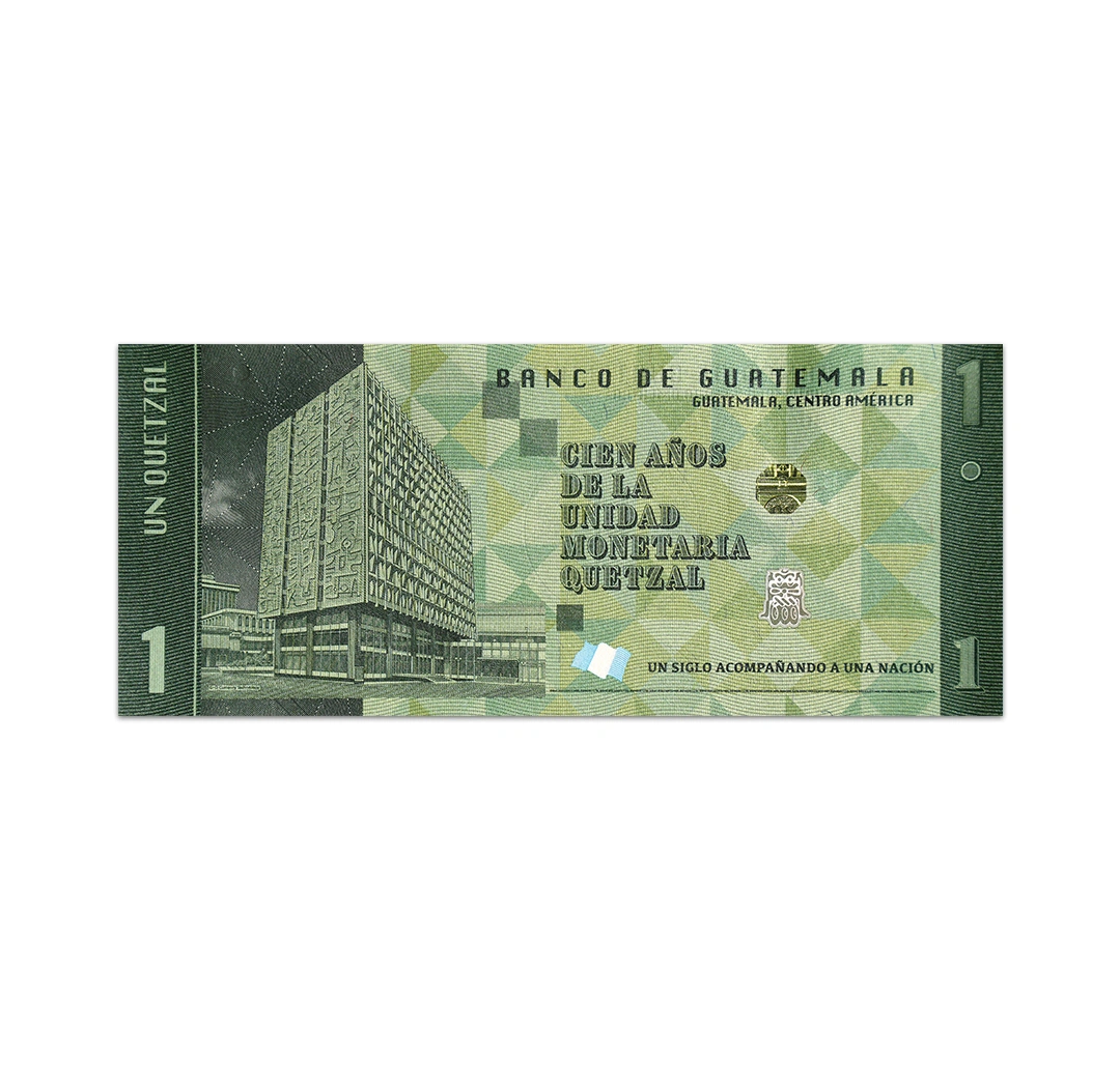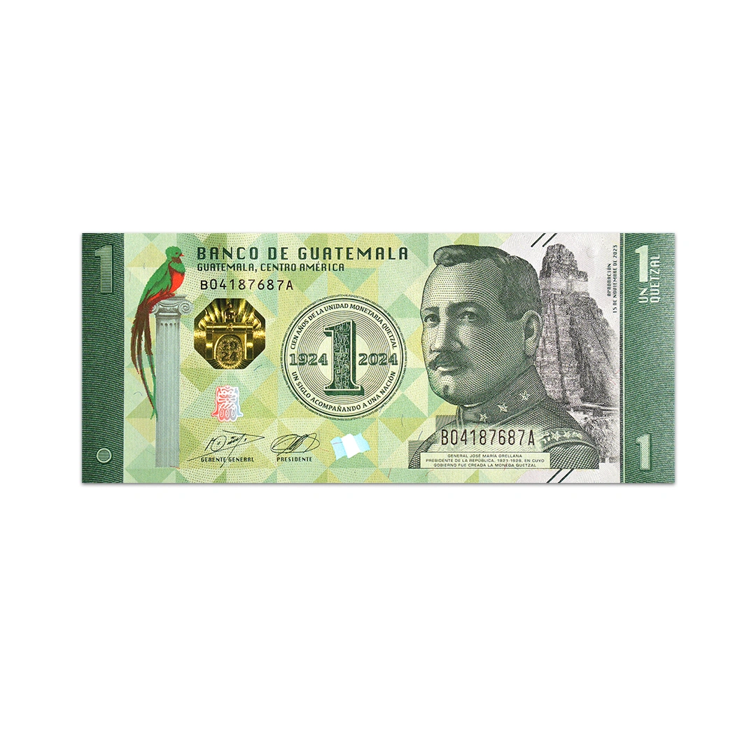 This uncirculated 1 Quetzal Guatemala note is a commemorative banknote issued by the Bank of Guatemala. It is a green, yellow, red, and brown note that is dated 2023, bear the signatures of Caceres and Gonzalez, and measures 156 x 67 mm. Its obverse side features Mayan number 1, quetzal bird perched on column, varifeye ColourChange gold-to-blue holographic patch, a Mayan glyph as registration device, the Guatemalan flag as registration device, president and general, Jose Maria Orellana, and Temple I in Tikal (Templo I, Tikal). Its reverse side shows the Bank of Guatemala headquarters building in Guatemala City (Edificio del Banco de Guatemala), Guatemalan flag as registration device, Mayan glyph as registration device, and Mayan number 1. Security features include a windowed security thread with an unknown watermark.