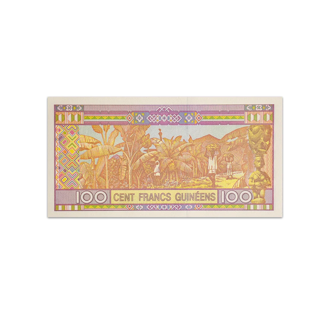 The Guinea 100 Francs banknote was issued by the Central Bank of the Republic of Guinea in 2015 featuring a woman wearing a headdress and the coat of arms of Guinea on the obverse. It also shows a stalk of wheat. The reverse of the purple banknote depicts workers harvesting banana and a carving of a woman with a load on her head. The paper bill bears a solid security thread but it doesn’t have a watermark. It is 130 x 64 mm in size and is in uncirculated condition.