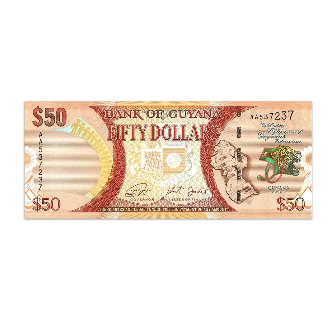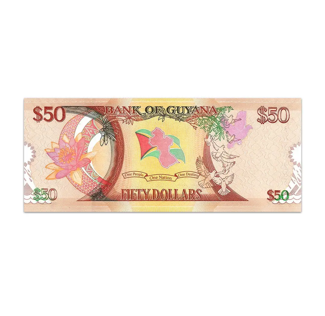 The Guyana 50 Dollar banknote was issued by the Bank of Guyana in 2016 to commemorate the 50th Anniversary of Independence. The paper bill features the national emblem, the map of Guyana, and the 50th-year of independence logo on the obverse side. The reverse of the banknote depicts Guyanas national flower Victoria amazonica, a tree branch, the countrys map on the national flag, and doves. The banknote is 156 x 65 mm in size and bears a watermark that reflects a Macaw bird with 50. This Guyana 50 Dollar banknote is in uncirculated condition.