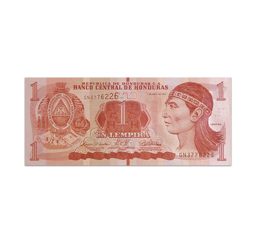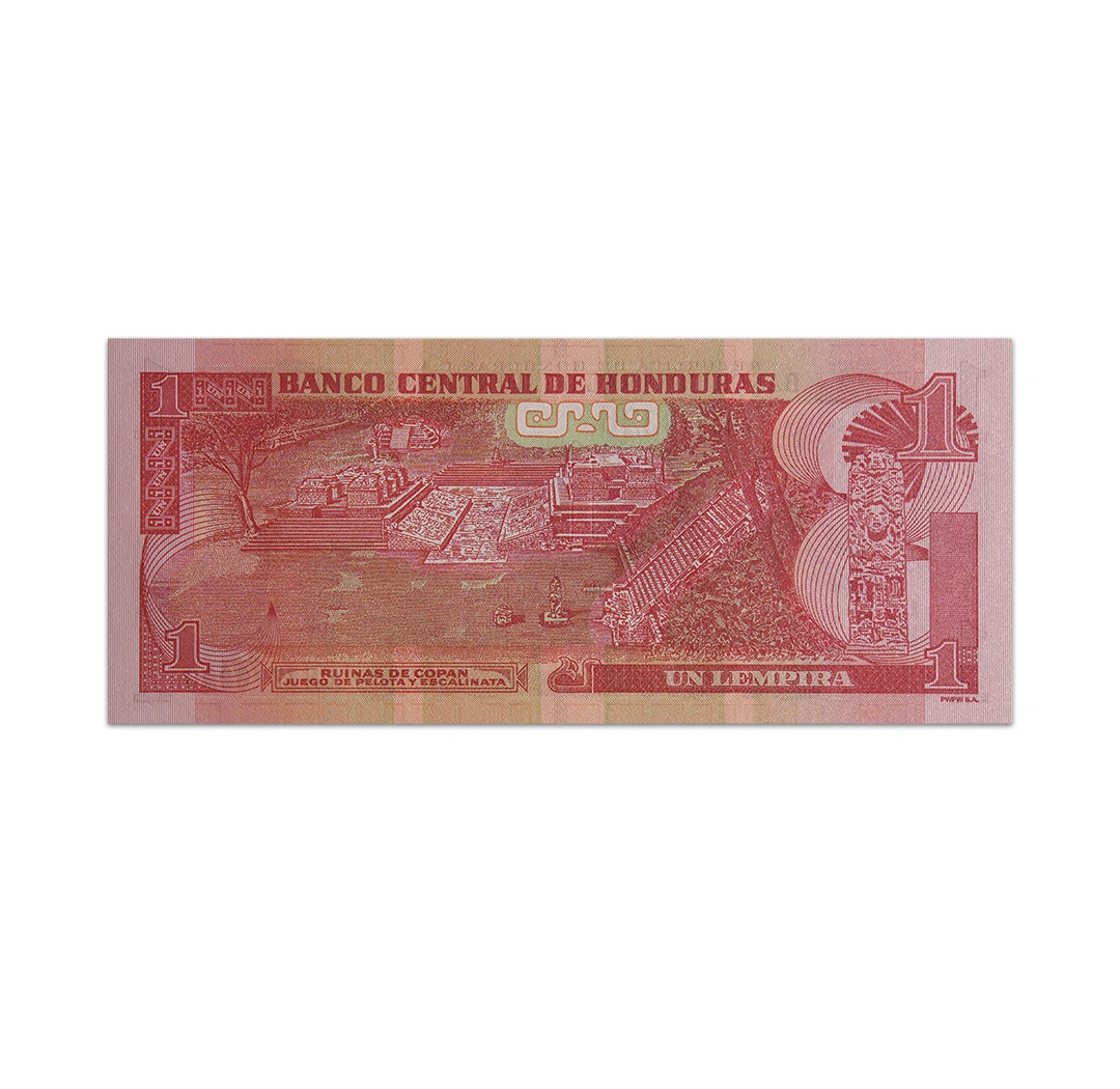 This uncirculated 1 Honduran lempira banknote is a standard circulation banknote issued by the Central Bank of Honduras. It is a red and green banknote that is dated 12 June 2022, bear the signatures of President Marlon Tabora Munoz, Governor Hector Mendez Calix, and Finance Secretary Wilfredo Cerrato R., and measures 156 mm x 67 mm. Its obverse side features Lempira and the coat of arms of Honduras. Its reverse side depicts a Mayan monolith and ruins of a ball court in Copan. The banknote does not have a security thread or a watermark.