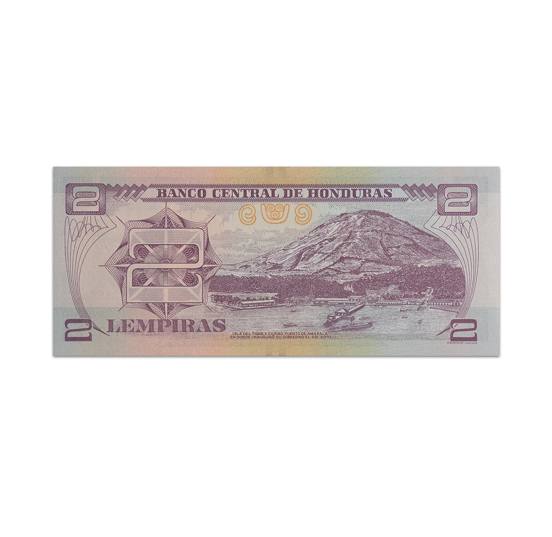 This uncirculated 2 Honduran lempira note is a standard circulation banknote issued by the Central Bank of Honduras. It is a purple note that is dated 20 June 2019, bear the signatures of Wilfredo Cerrato R., Aracely O’Hara Guillen, and Rocio I. Tabora Morales, and measures 156 mm x 67 mm. Its obverse side features Marco Aurelio Soto and the national coat of arms. Its reverse side shows the Tiger Island and the port city of Amapala. The note does not have a security thread or a watermark.