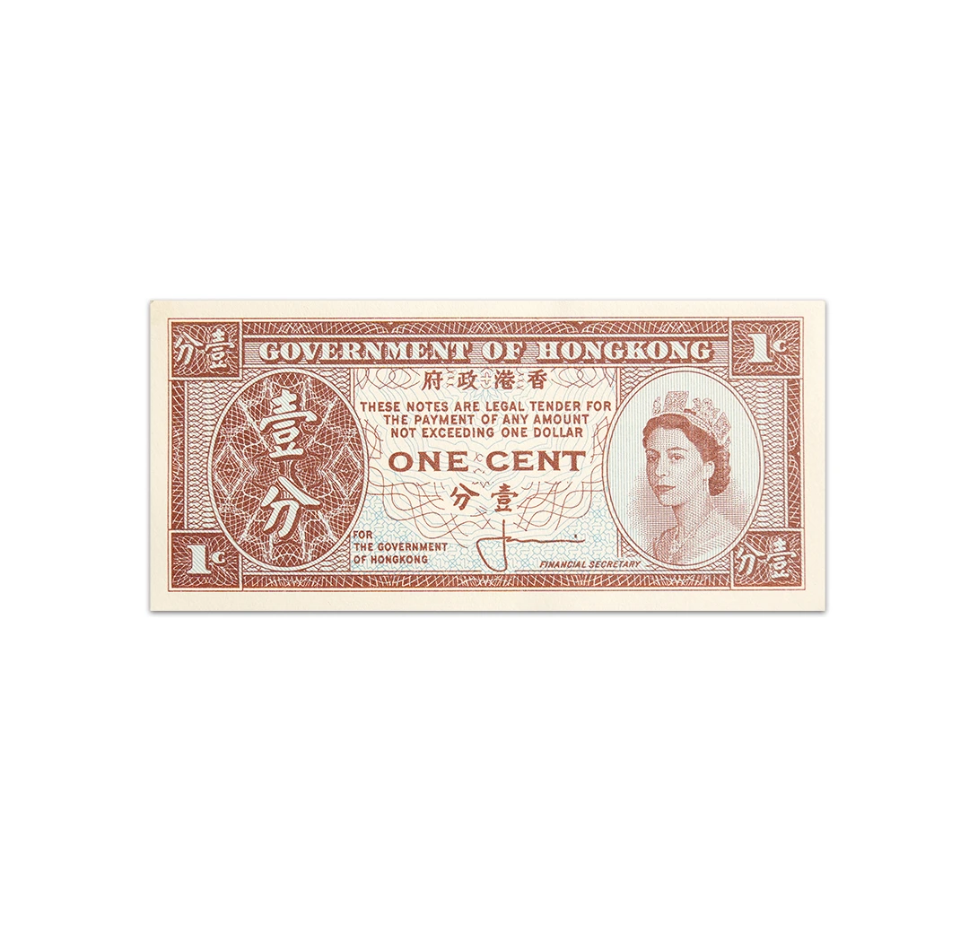 This Hong Kong 1 Cent banknote from 1961-1971 ND measures 89 x 42 mm. The front design of the note depicts a portrait of Queen Elizabeth II. Her Majesty is the longest-reigning British monarch in history. The reverse side of the note is a blank space. The note does not contain any security threads nor watermarks.