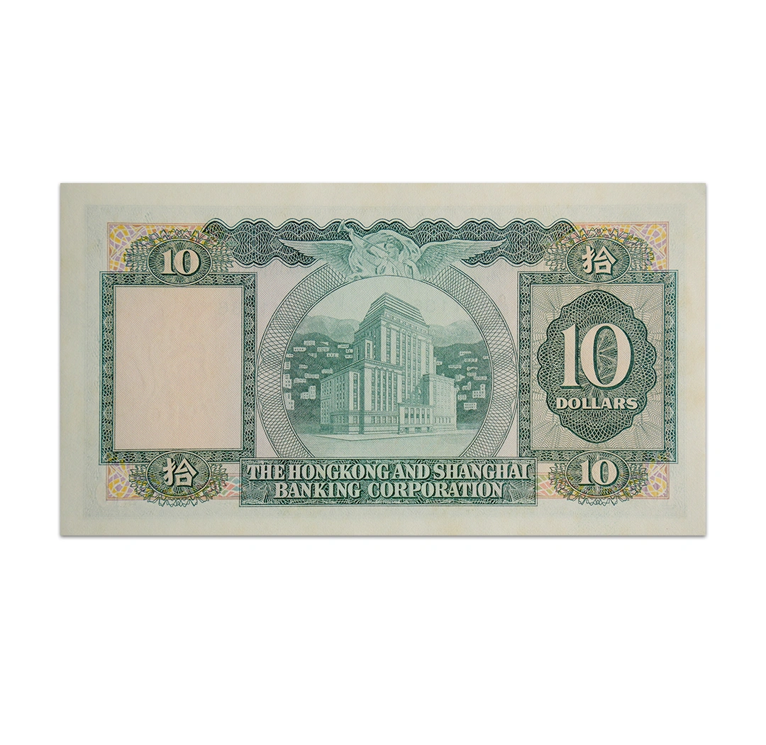 This uncirculated 10 Hong Kong dollar banknote is dated 31 March 1981. It is green in color and measures 152 mm long and 85 mm wide. Its obverse side shows an allegorical woman with a sheaf of wheat and a crowned coat of arms. Its reverse side features the third headquarters building of the Hong Kong and Shanghai Banking Corporation (HSBC) in the Central District and an angel with a trumpet. Though the note does not have a security thread, it has a watermark that shows a helmeted warrior’s head in profile and 10.