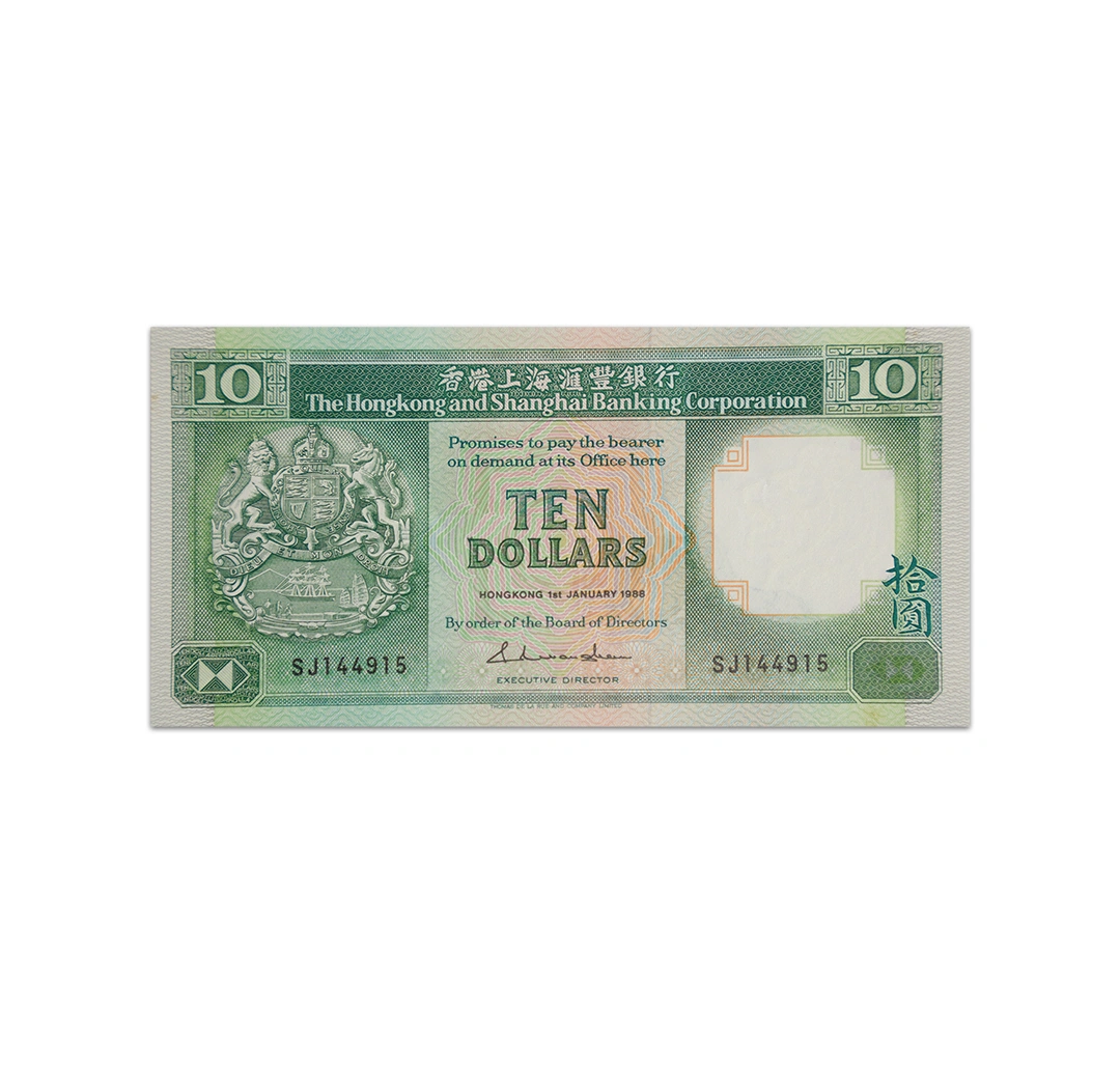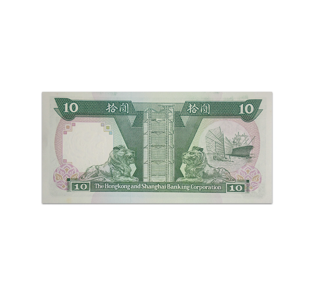 This 10 Hong Kong dollar note is a standard circulation banknote issued by the Hong Kong and Shanghai Banking Corporation. It is a green, orange, pink, and blue note that is dated 1 January 1988, bears the signature of the HSBC manager, and measures 138 mm x 69 mm. Its obverse side features a lion rampant, a crowned coat of arms, a unicorn rampant, a sailing ship, and a Chinese junk ship. Its reverse side shows two reclining lion statues flanking the 4th HSBC headquarters building in Central District, a Chinese junk ship, and a modern freight ship. Security features include a solid security thread and a watermark of a lion head in profile.