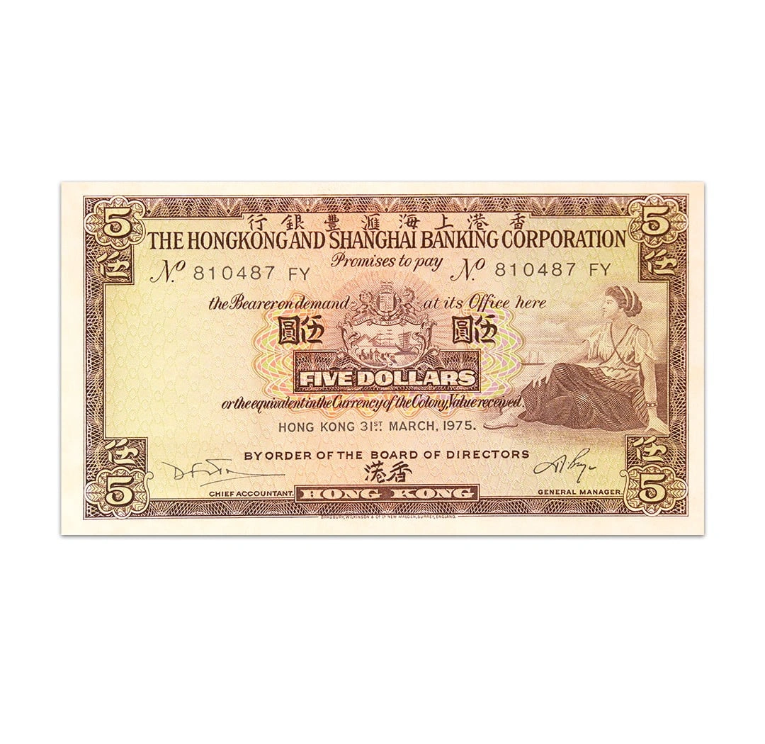 This Hong Kong 5 Dollar banknote from 1971 has a dimension of 142 x 79 mm. Printed on its front design is the crowned Coat of Arms depicting a lion and unicorn rampant, a sailing ship at sea, a Chinese junk, and a seated allegorical woman. The reverse side features a winged female angel with trumpet and the 3rd HSBC headquarters building in Central District, Hong Kong, the stripped classical style building served as the government headquarters during the Japanese invasion in World War II. The note does not contain any security threads however a watermark image of a helmeted warriors head in profile and numeric 5 is added to the design for enhanced security.