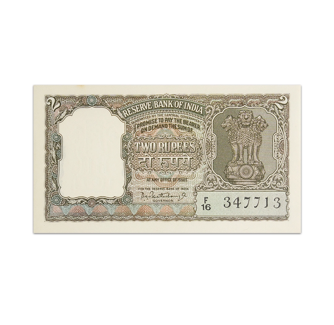 India 2 Rupees 1965 PC Bhattacharya Olive Green Issue P-31