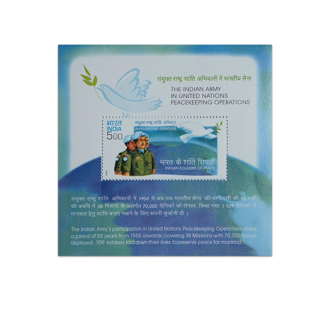 The sheet commemorates over five decades of India's participation in UN peacekeeping, involving more than 70,000 troops across 36 missions. It stands as a testament to India's dedication to the UN Charter and its objectives
