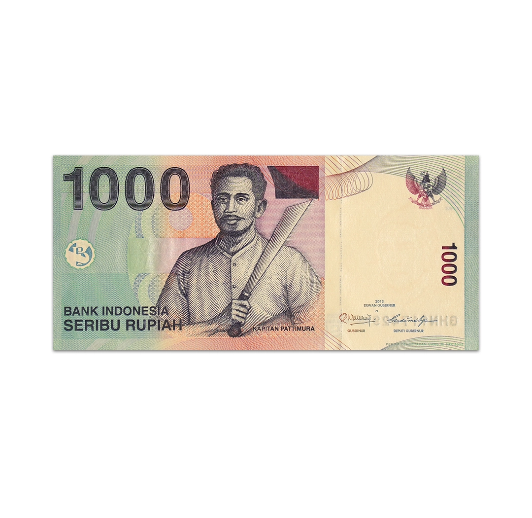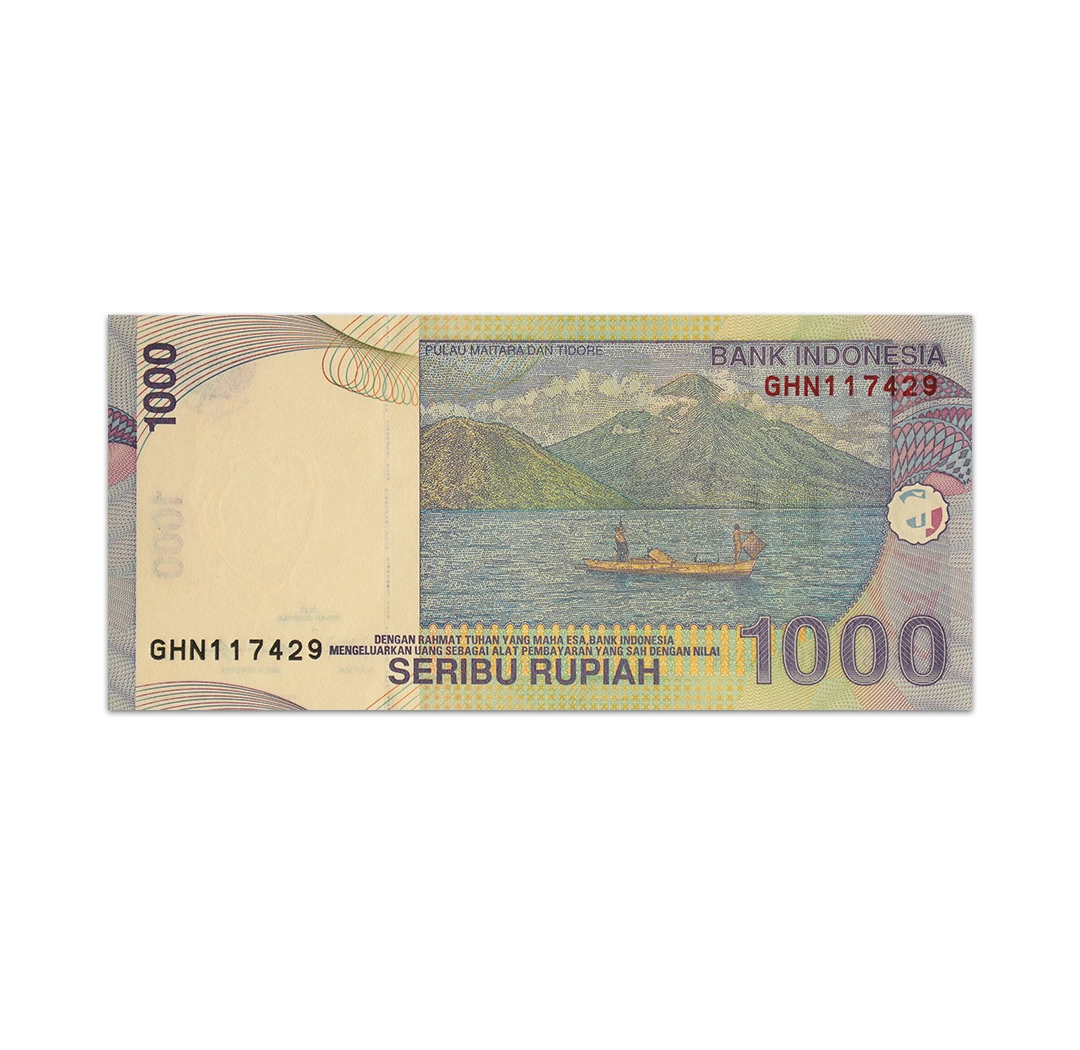 The 1,000 Indonesian Rupiah Banknote from the 2000-2016 series features a portrait of Kapitan Pattimura. Its obverse side features the coat of arms of Indonesia and Thomas Matulessy, also known as Kapitan Pattimura holding a machete. The reverse side features the beautiful Maitara and Tidore islands, a picturesque view of the lake with two men in a boat, mountains, and clouds. The note is 141 x 65 mm in size and is equipped with a solid security thread printed with BANK INDONESIA to enhance its security features. A shadow image of Tjut Meutia is also made visible under a UV light. It is also signed by DEPUTY GUBERNUR SENIOR Anwar Nasution and DEPUTY GOVERNOR Aulia Pohan. This particular banknote is in uncirculated condition.