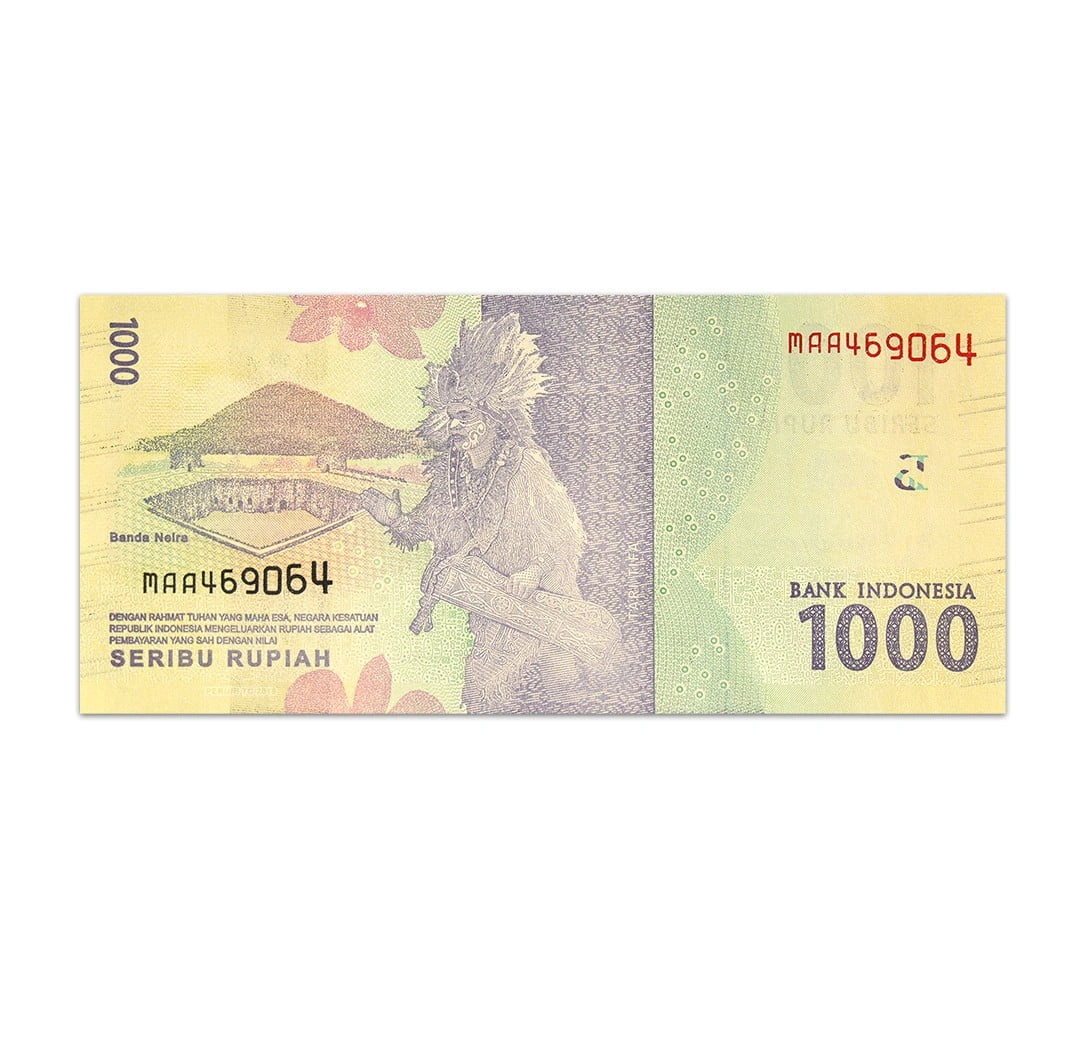 This uncirculated 1,000 Indonesian rupiah note is a standard circulation banknote issued by Bank Indonesia. It is a green, orange, purple, and red note that is dated 2016/2018, bear the signatures of Perry Warjiyo and Mrs. Sri Mulyani Indrawati, and measures 141 mm x 66 mm. Its obverse side features Tjut Meutia, the map of Indonesia, and the national coat of arms. Its reverse side shows Fort Belgica, the Spice Islands, an orchid flower, and a Tari Tifa (dancer with drum). Security features include a bank logo registration device, a solid security thread with printed BANK INDONESIA, and a watermark of Tjut Meutia.