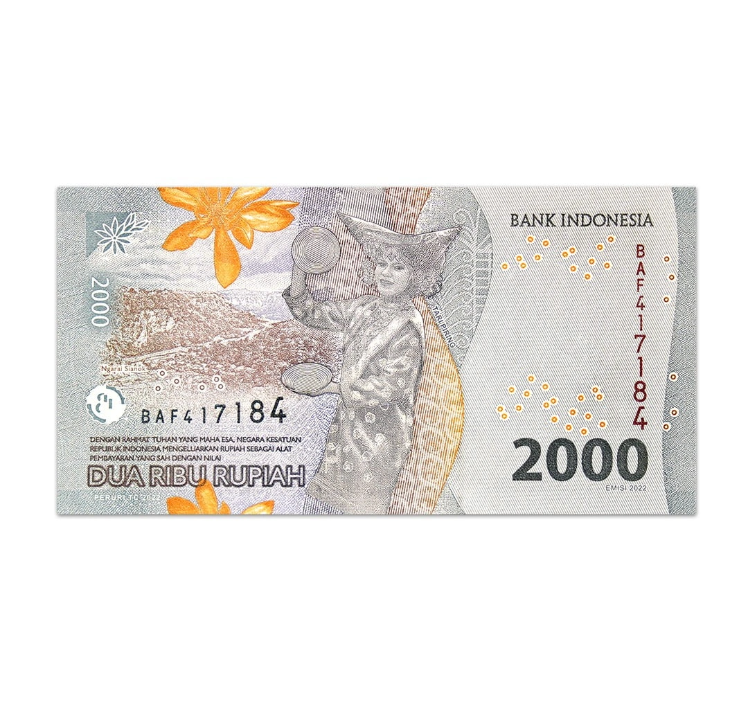 This uncirculated 2,000 Indonesian rupiah banknote is a standard circulation note issued by Bank Indonesia. It is a blue and gray banknote that is dated 2022, bears the signatures of Perry Warjiyo and Mrs. Sri Mulyani Indrawati, and measures 126 mm x 65 mm. Its obverse side features Mohammed Hoesni Thamrin, the national coat of arms of Indonesia, and an outline map of Indonesia. Its reverse side depicts a Tari Piring dancer and a view of Ngaral Sianok from Sumatra. Security features include a solid security thread with printed BI 2000 and a watermark of Prince Antasari.