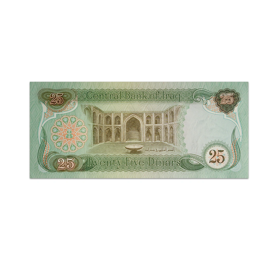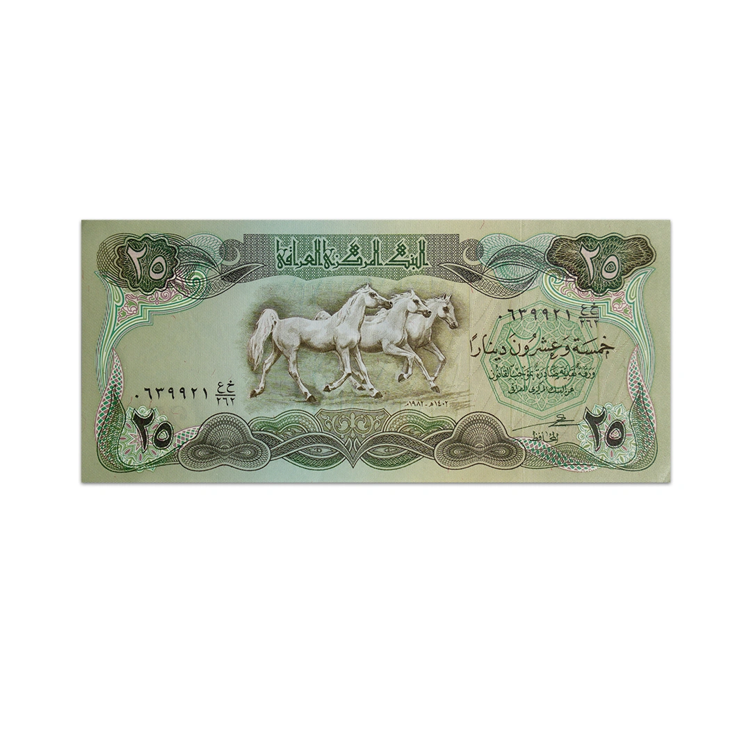 This Iraq 25 Dinar banknote from 1982 depicts three Arabian horses on the front design while the reverse side features the fountain in the courtyard of the Abbasid Palace in Baghdad. The note is 175 x 80 mm in size and contains a solid security thread and a horse head watermark for added security.