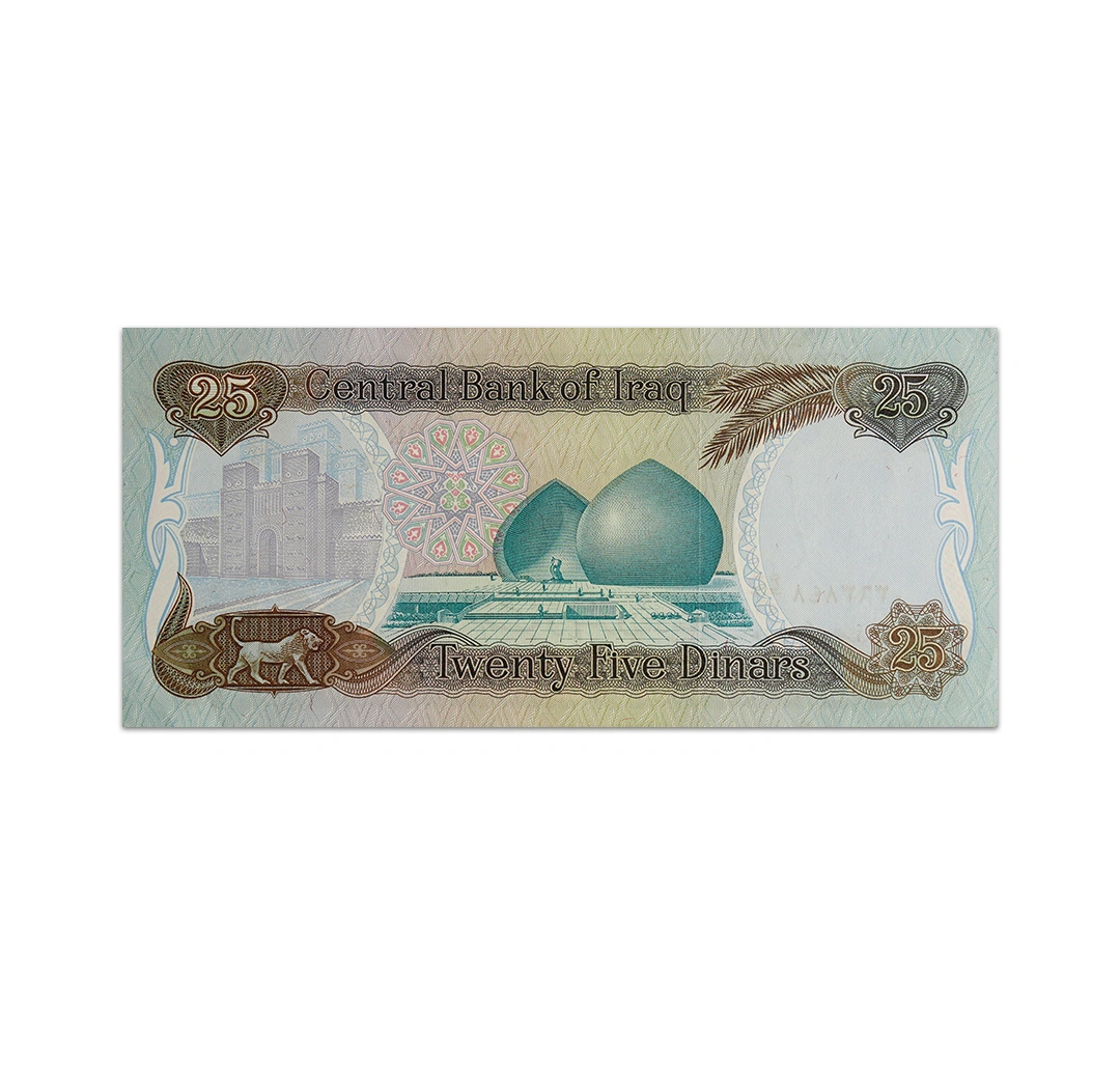 The Iraq 25 Dinar banknote was released by the Central Bank of Iraq in 1986. It comes in a combination of brown and green. Its obverse side features Saddam Hussein who served as the fifth president of Iraq. It also shows charging horsemen with swords, spears, and banners. The back of the paper bill depicts a city gate, a lion, palm fronds, and the al-Shaheed Monument which is also popularly known as the Martyr’s Memorial. This banknote bears a solid security thread and a watermark that reflects Saddam Hussein. It is 175 x 80 mm in size and is in used condition.
