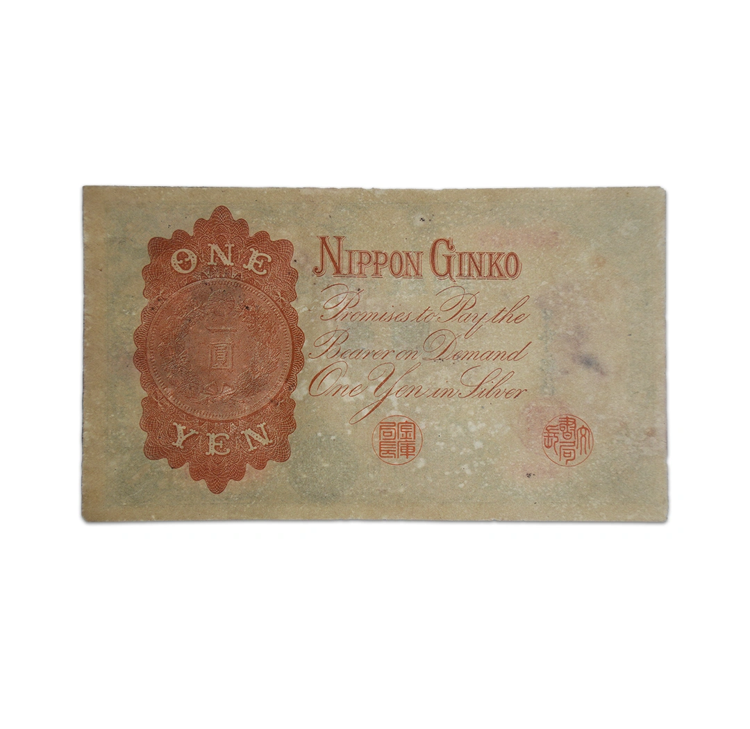 The Japan 1 Yuan Banknote from 1916 is part of the 1910 - 1917 Gold Certificate series, which depicts a portrait of a character from ancient Japanese history. Its obverse side features Takeuchi no Sukune, a legendary Japanese hero and god. The reverse side features a rosette, a 1-yen gold coin from 1874, and an exchange clause. The note is 145 x 85 mm in size and does not contain any security threads however when placed under a UV light, a watermark image of paulownia leaves is visible.