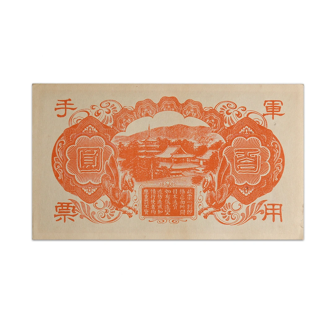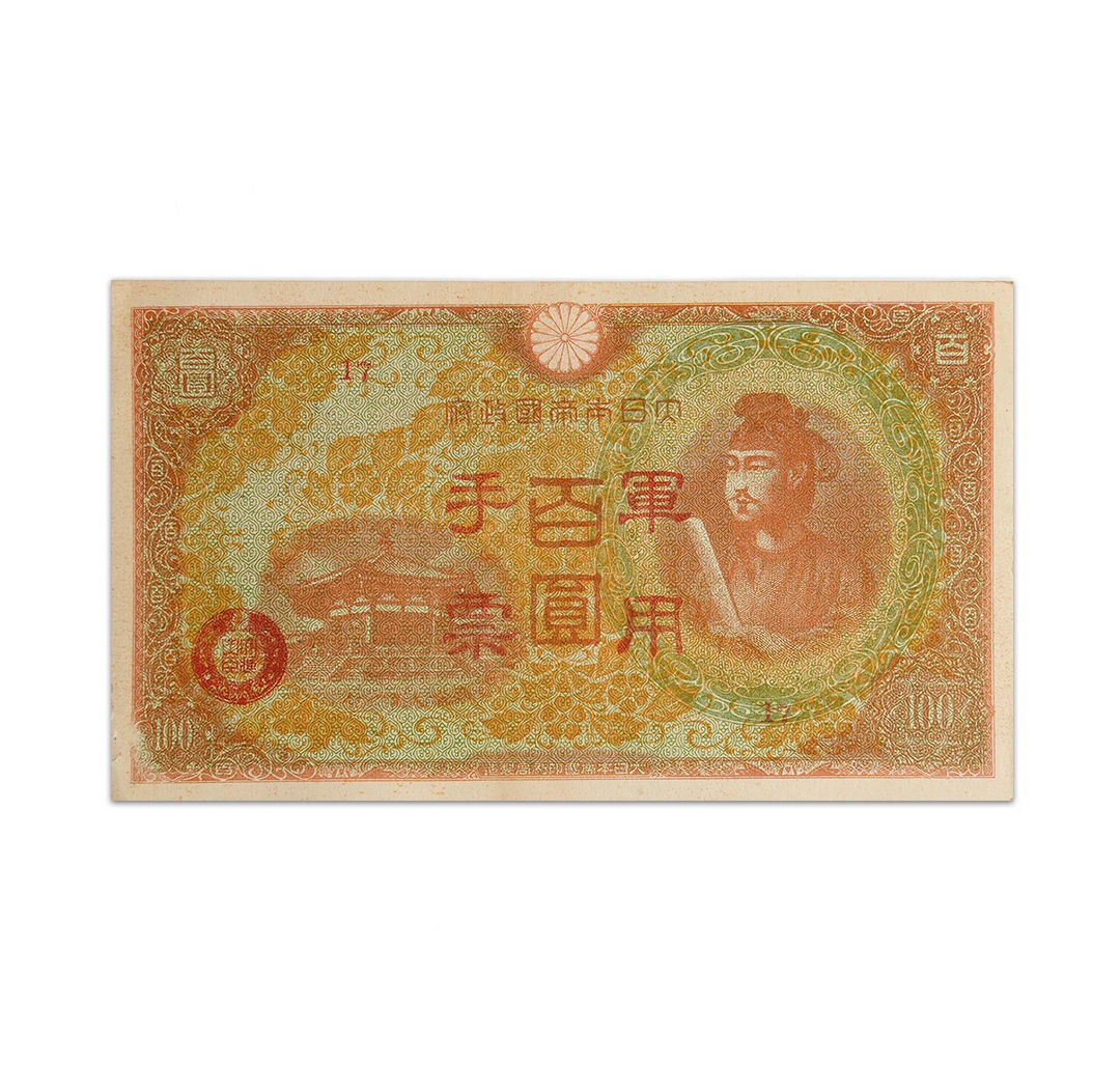 This AUNC 100-yen note is a standard circulation banknote issued by the Japanese Imperial Government for China in 1945. It is a red note that measures 163 mm x 94 mm. Its obverse side features the Yumedono Pavilion and a portrait of Shotoku-taishi. Its reverse side shows the Horyuji Temple. The note does not have a security thread or a watermark.