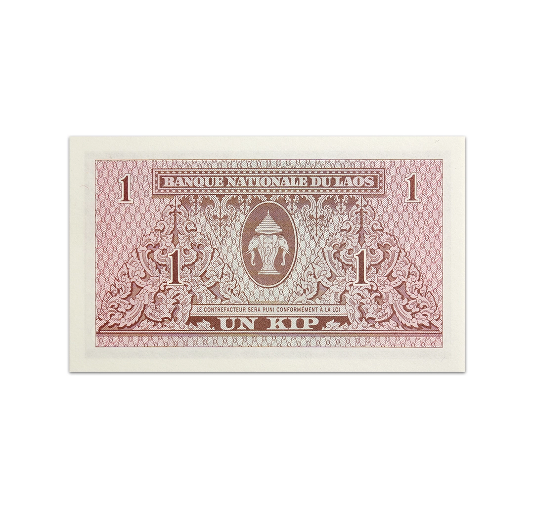 The Laos 1 Kip Banknote was issued by the government of Prince Souvanna Phouma in 1962. The note comes in a brown and pink color combination. Featured on its obverse is a stylized mythological angel. The reverse of the note depicts the coat of arms of Erawan, a three-headed elephant. The paper bill does not contain a security thread and watermark. It is 100 x 60 mm in size and is in uncirculated condition.