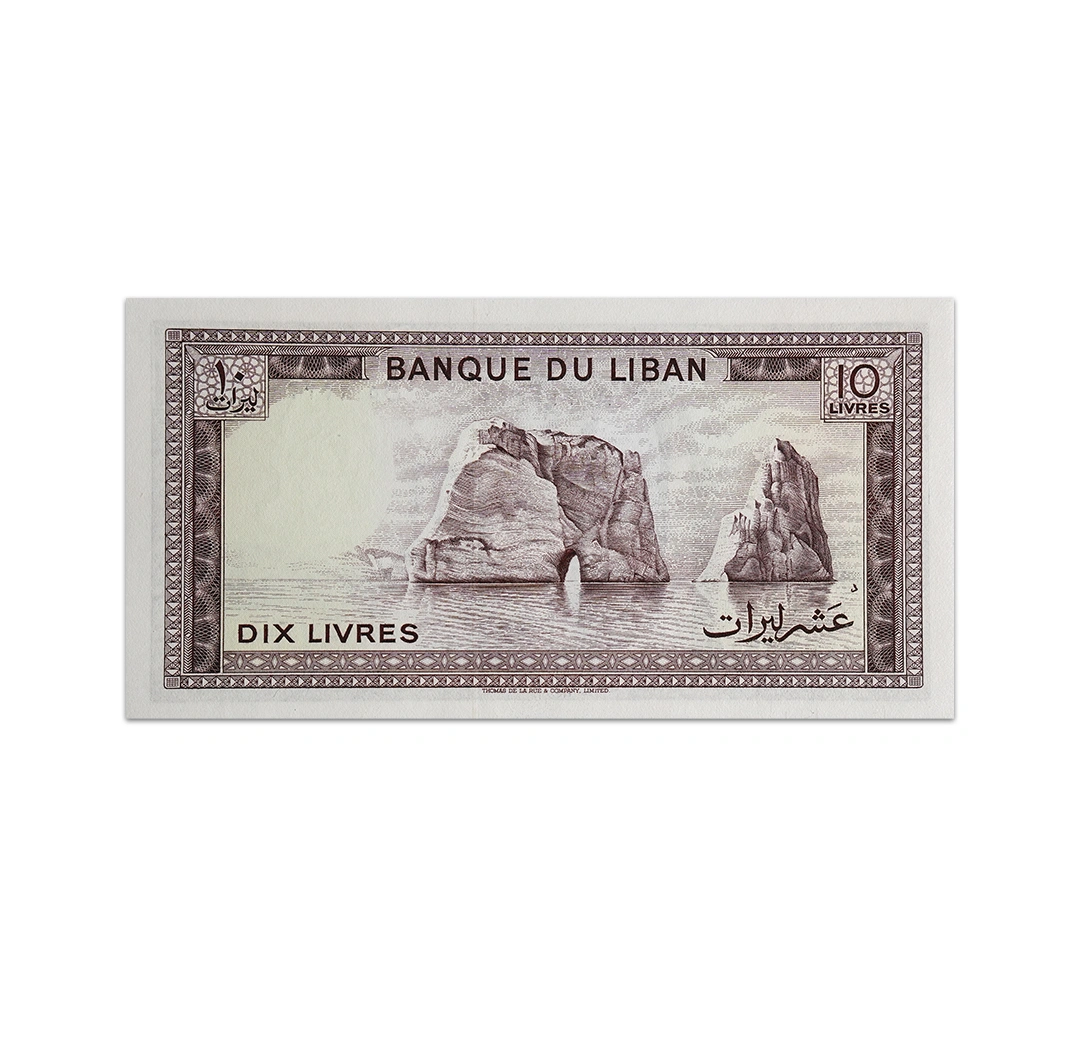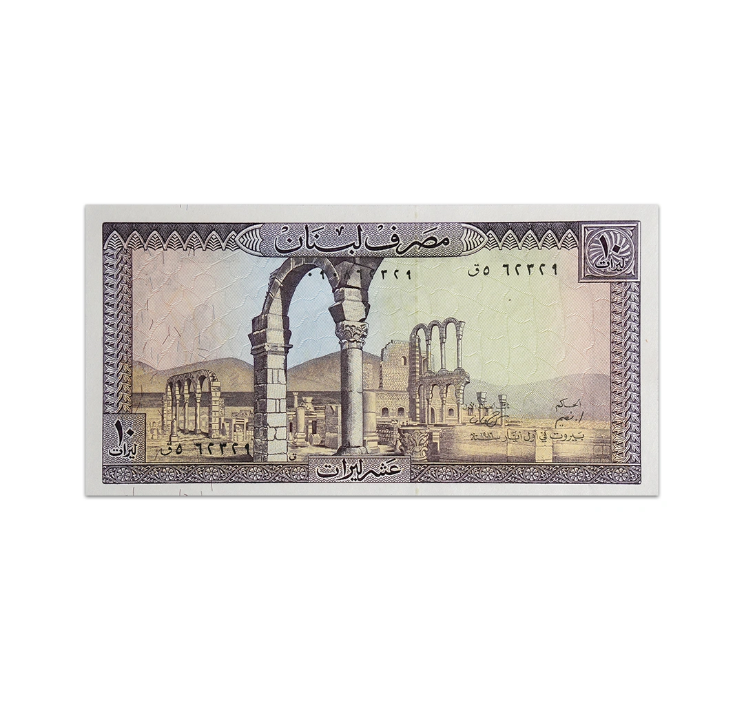 The 10 Lebanese livre banknote has two currencies printed on the note: the pound in Arabic and the livre in French. The front side of the note contains the archaeological ruins of Umayyad palace in Anjar. The backside depicts the view of the natural arches of Pigeon Rocks from Raouche Corniche in Beirut. The note has a solid segmented security thread and a watermark of a mans head. Its dimensions are 145 mm by 75 mm.