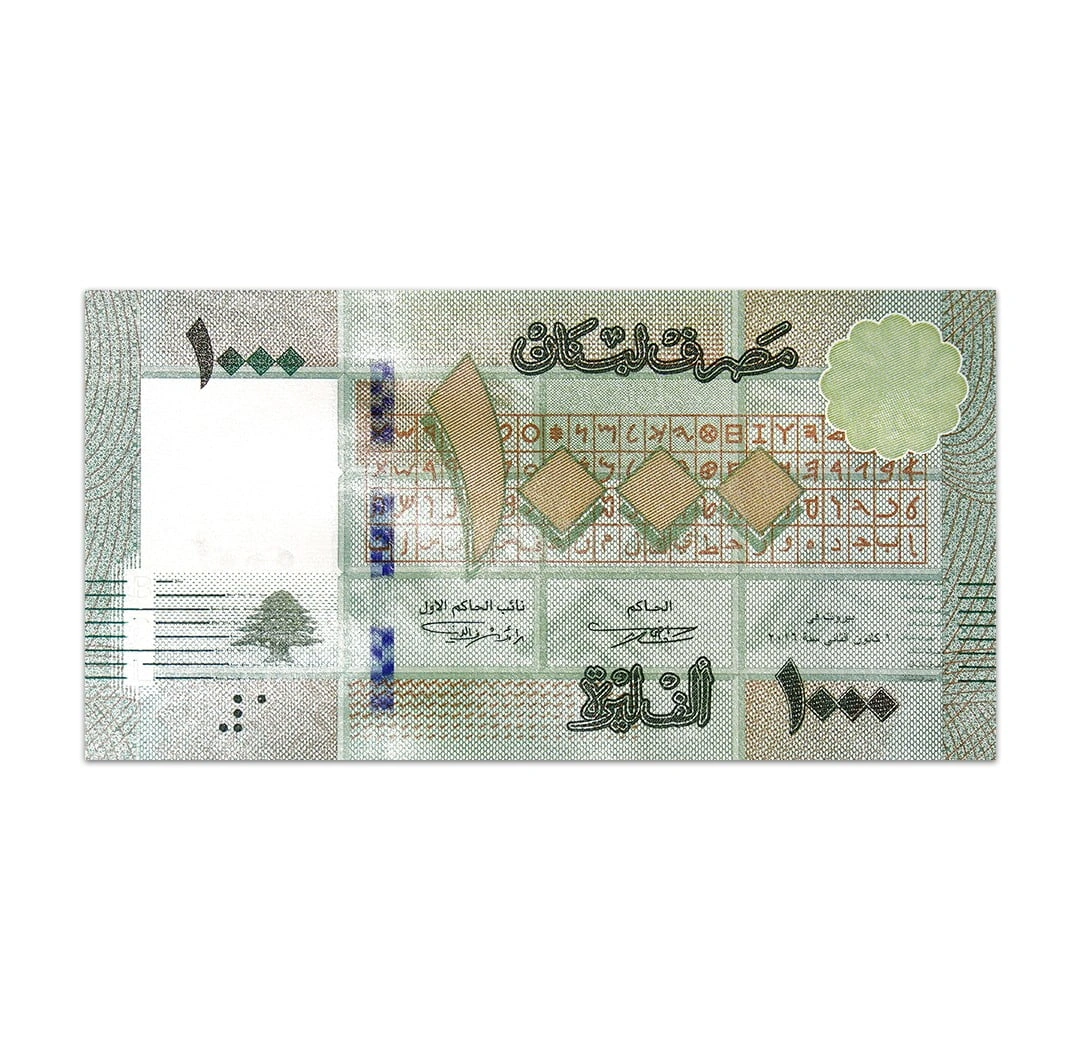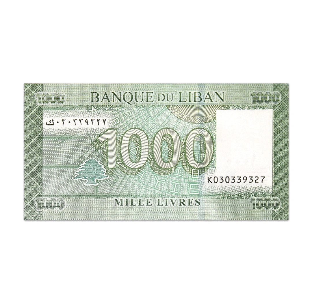 This uncirculated 1,000 Lebanese livre banknote is a standard circulation banknote issued by Banque du Liban. It is a green banknote that is dated 2016, bear the signatures of First Vice Governor Raed H. Charafeddine and Governor Riad T. Salameh, and measures 115 mm x 60 mm. Its obverse side features alphabetic characters and a cedar tree. Its reverse side depicts alphabetic characters and a cedar tree. Security features include a 3-mm wide magenta-to-green windowed security thread with a demetalized BDL 1000 and a watermark of a coat of arms with an electrotype 1000.
