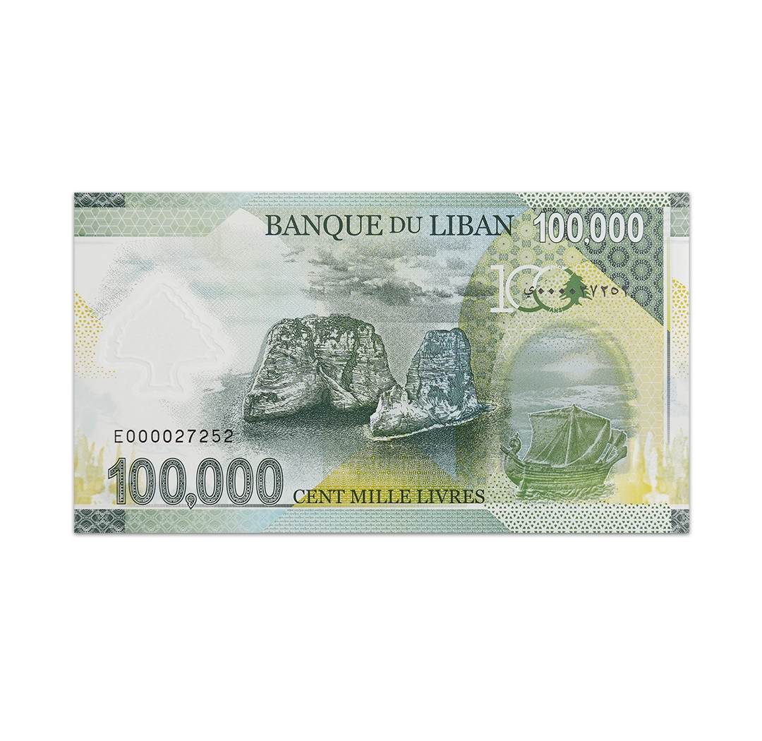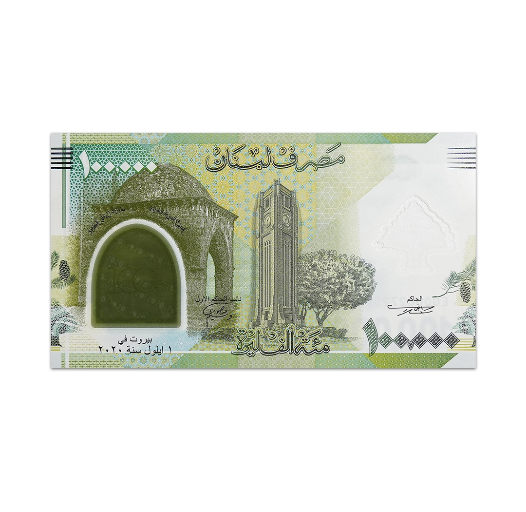 The Lebanon 100,000 Livres polymer banknote was released by the Bank of Lebanon in 2020 to commemorate the 100th Anniversary of the Founding of the Greater State of Lebanon. The obverse features Parliament Square which represents the country’s independence and democracy. It also shows the Alabed Nejmeh Square clock tower and a cedar tree. The reverse of the paper bill depicts the Arches of Pigeon Rocks in Beirut and a Phoenician merchant ship. The banknote measures 147 x 82 mm and bears a watermark that reflects a holographic window with the years 1920 and 1920 and a transparent window. It also carries the signatures of Riad T. Salameh and Dr. Wassim Manssouri. This commemorative polymer banknote is in uncirculated condition.