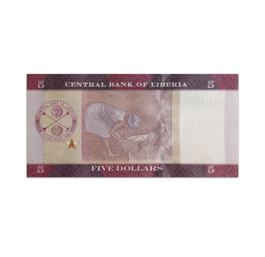 The Liberia 5 Dollar banknote was issued by the Central Bank of Liberia in 2016 featuring a portrait of 5th president, Edward James Roye on its obverse. The reverse of this purple banknote depicts the bank seal with crossed kissi money and the front and back of a 1969 50-cent coin. It also shows a 5-pointed star and a woman harvesting rice. The banknote is 133 x 66 mm in size and bears a 3-mm wide windowed security thread that shifts color when titled. It also has a watermark that bears the coat of arms of Liberia with an electrotype CBL. This paper bill carries the signature of Lusinee Camara and Milton Weeks and is in uncirculated condition.