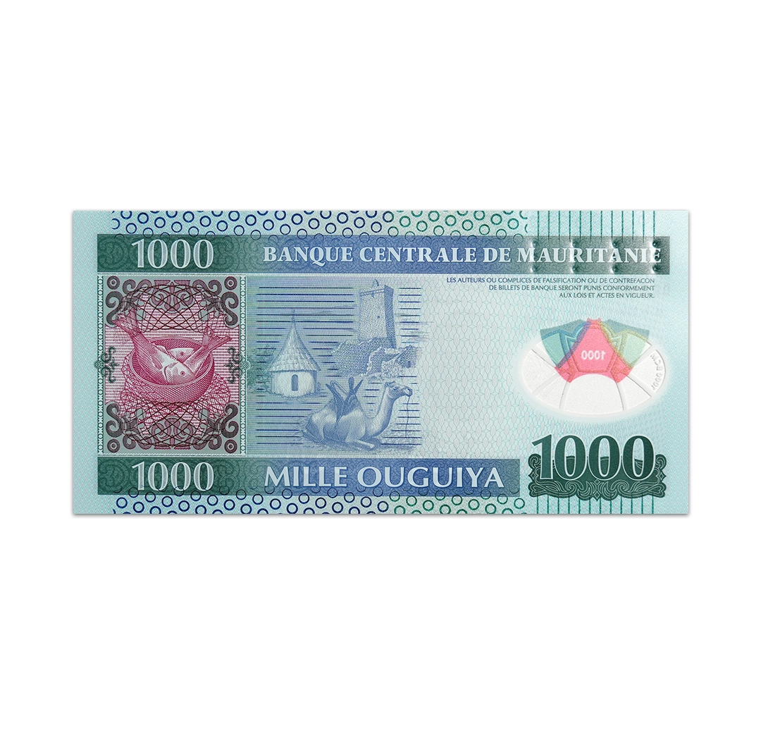 Mauritania issued its first significant design upgrade of its 1000 Ouguiya in 2014 when it issued a polymer version (P19). It was an unusual decision as the lower denominations (100, 200, and 500) used a hybrid substrate and the higher denominations (2000 and 5000) used a paper substrate.\n\nThe banknote includes an oval window and a lightly printed image to mimic a watermark. It is blue-green and contains desert images and themes similar to the other denominations of the time.
