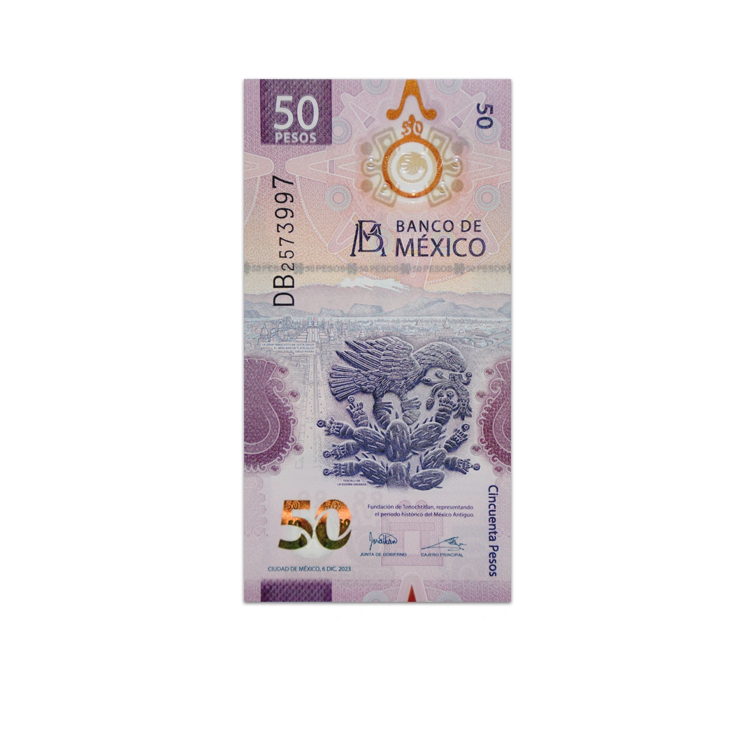 The Mexico 50 Pesos Banknote was issued by Bank of mexico in a 2021 printed on polymer. Its obverse shows a fragment of the back of the "TEOCALLI DE LA GUERRA SAGRADA" monolith of an Aztec temple showing an eagle perched on cactus with the "Atl tlachinolli" in its beak.It also shows Diego Rivera's mural illustrating the city of Tenochtitlan. The reverse depicts the ecosystem for rivers and lakes showing the axolotl with trees in the background in Xochimilco, in Mexico. The banknote contains a clear window watermark with the denomination. It also bears a simulated security thread with printed 50 PESOS. It is 65 x 125 mm and is signed by Galia Borja Gomez and Alejandro Alegre Rabiela. This banknote is in uncirculated condition.