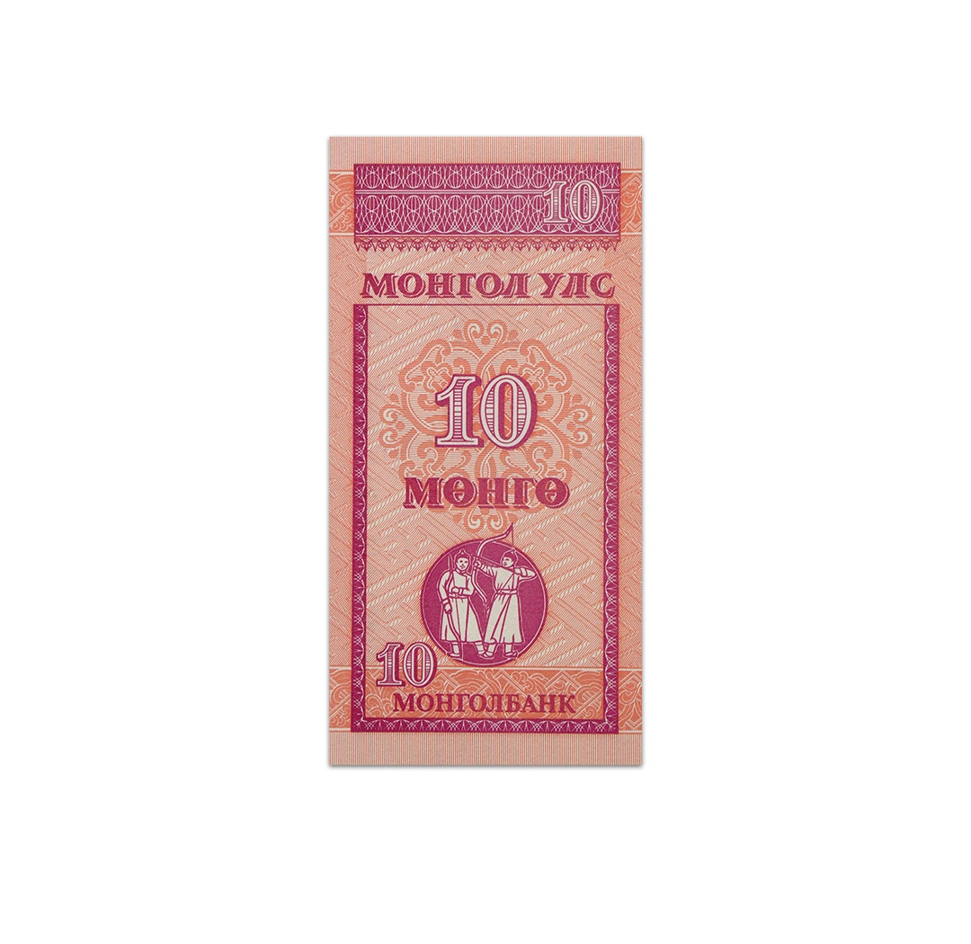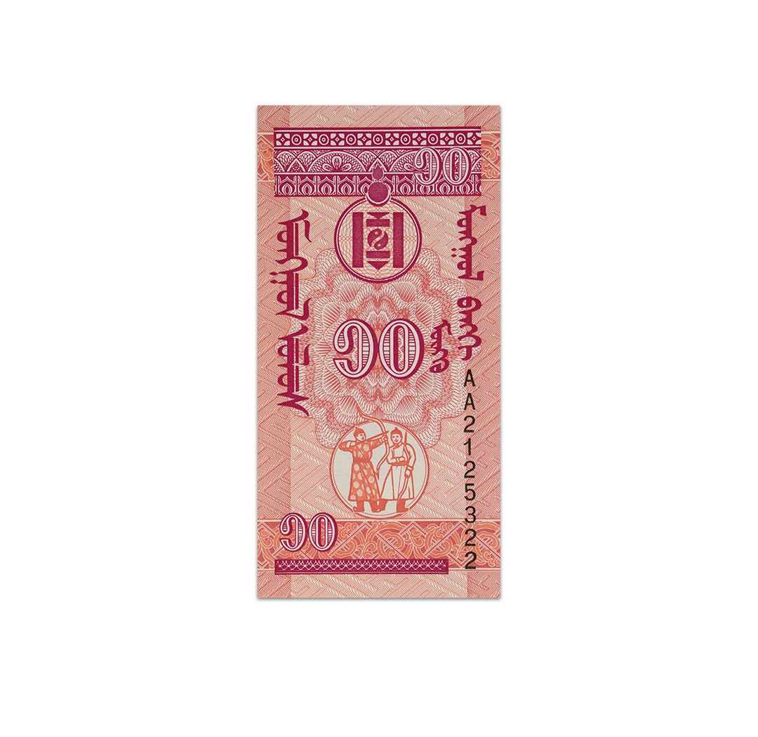 The Mongolia 10 mongo banknote is part of the 1993 series. Like the other banknotes of this series, the Mongolia 10 mongo is vertically-oriented. The upper portion of its front side has the Soyombo symbol and below are two archers with bows and arrows. Two archers with bows and arrows are also visible on the banknotes reverse side. This 45 x 90 mm paper currency has no security thread and watermark.