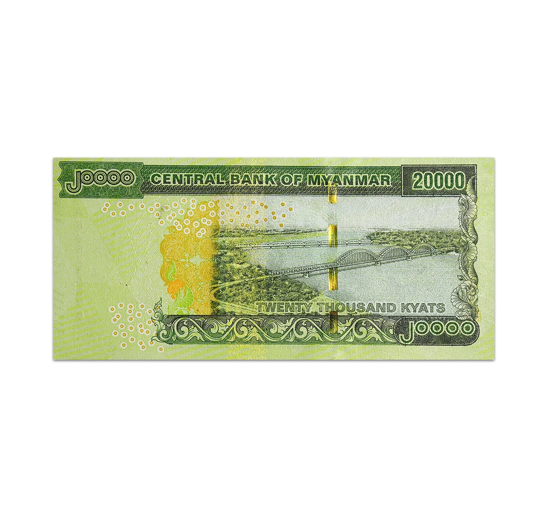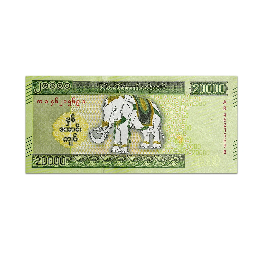 This uncirculated 20,000 Burmese kyat note is a standard circulation banknote issued by the Central Bank of Myanmar. It is a green note that is dated 2023 and measures 150 mm x 70 mm. Its obverse side features an elephant. Its reverse side shows Sagaing Bridge and Irrawaddy Bridge. Security features include a windowed security thread and a watermark of the head of Yadana white elephant with an electrotype 20000.