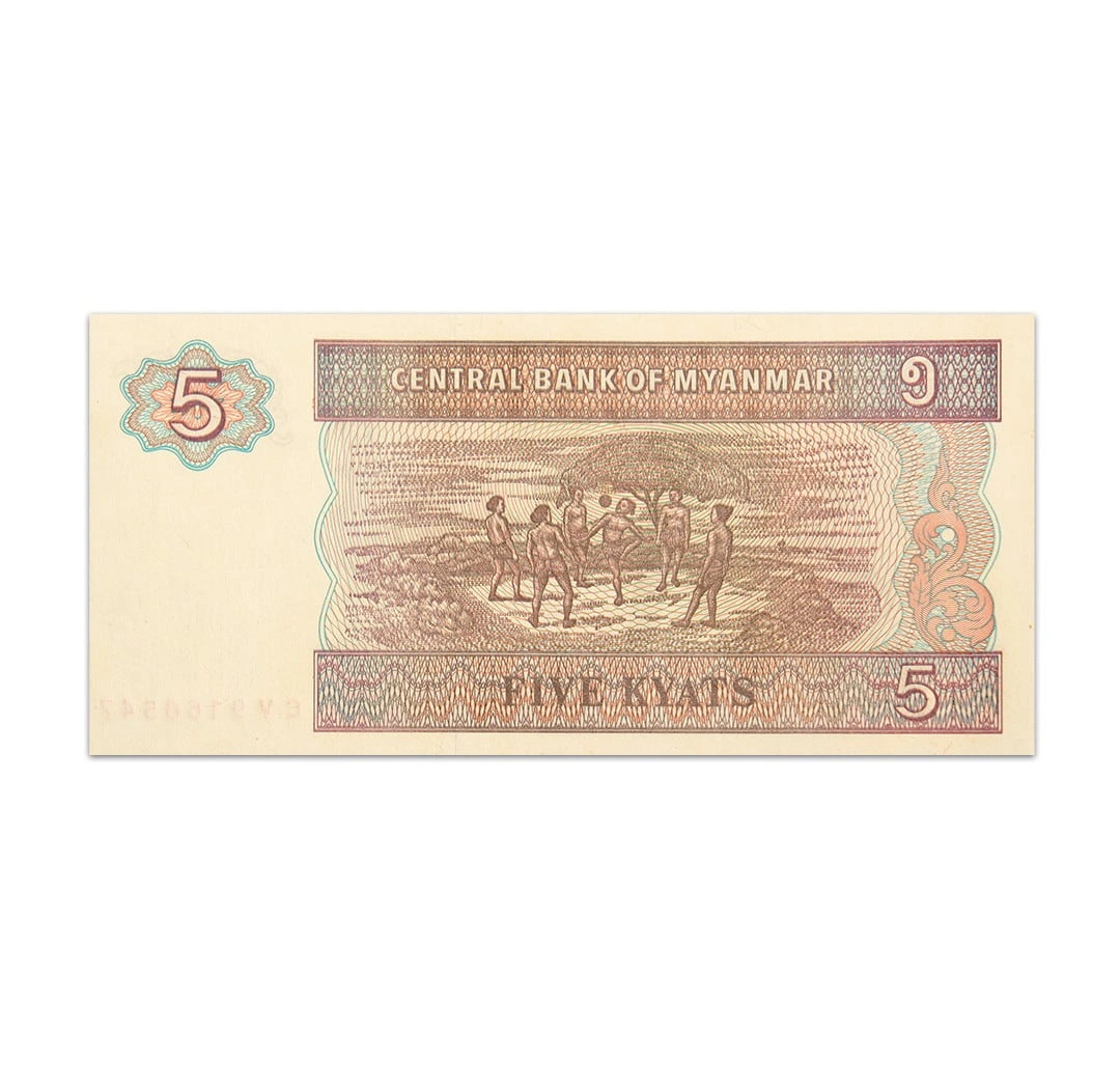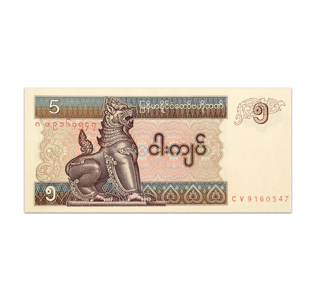 This uncirculated 5 Myanmar kyats note was introduced by the Central Bank of Myanmar in 1995 ND as part of the Chinthe (King Lion) Issues. It has dark brown and blue-green colors and dimensions of 130 mm x 62 mm. Its obverse side contains Burmese text and a sitting chinthe. Its reverse side depicts a game of chinlon (cane ball). Security features of the note include a solid security thread and a watermark of the Chinthe and the denomination in Burmese text.