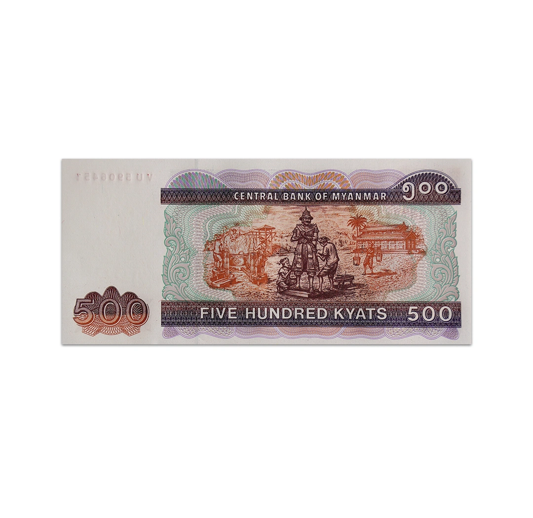This red-brown, tan, and brown 50 kyat note from Myanmar is part of the Chinthe series introduced in 1994. Its obverse side contains a portrait of a chinthe, also known as a King Lion in Myanmar. Its reverse side depicts a lacquer ware worker and his wares. The note has a solid security thread and a chinthe watermark. It is in uncirculated condition and measures 146 mm long and 70 mm wide.