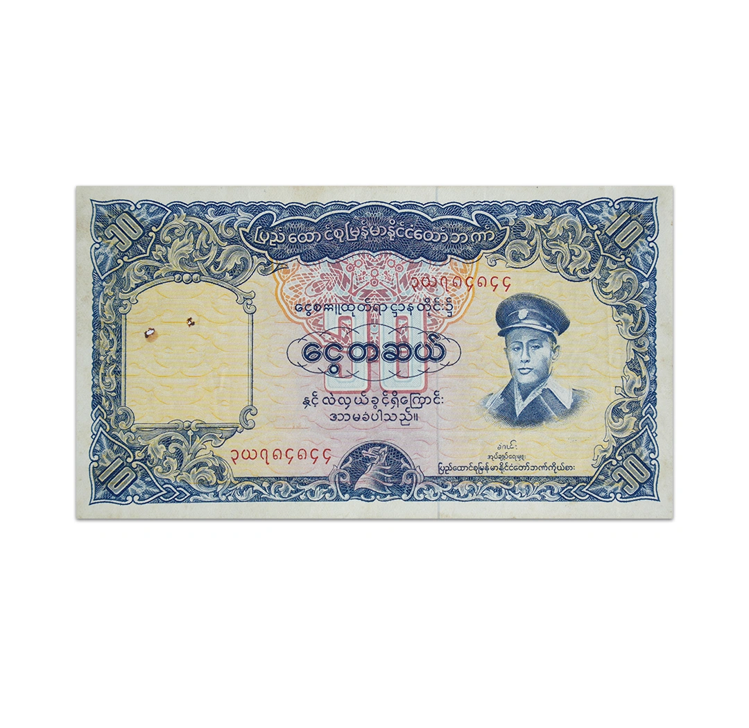 This uncirculated 10 Burmese kyat banknote is a standard circulation banknote introduced by the Union Bank of Burma. It is a blue, green, violet, and yellow banknote that bears the signature of U San Lin, and measures 147 mm x 82 mm. Its obverse side shows a chinthe and a portrait of General Aung San. Its reverse side depicts a chinthe and a mahout on an elephant lifting a tree with a trunk. Security features include a solid security thread and a watermark of Aung San.