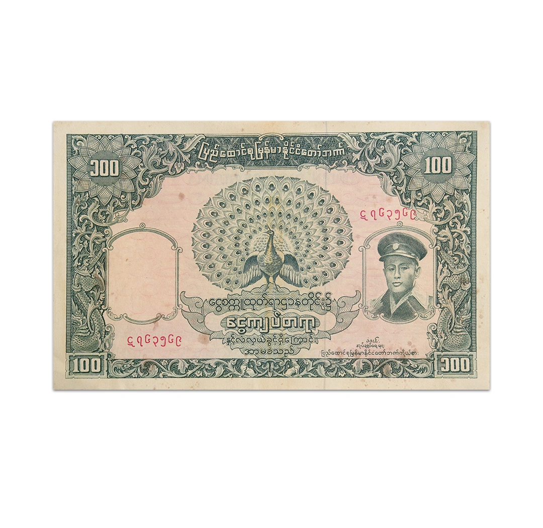 This used 100 kyats Burma note is a standard circulation banknote issued by Union Bank of Burma. It is a green and pink note that is dated 1958, and measures 160 x 100 mm. Its obverse side features General Aung San wearing a uniform with a peak cap dragon. Its reverse side shows a man in paddy with oxen team, building and trees. It has a solid security thread and a watermark of Aung San.