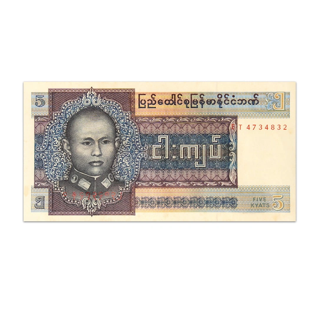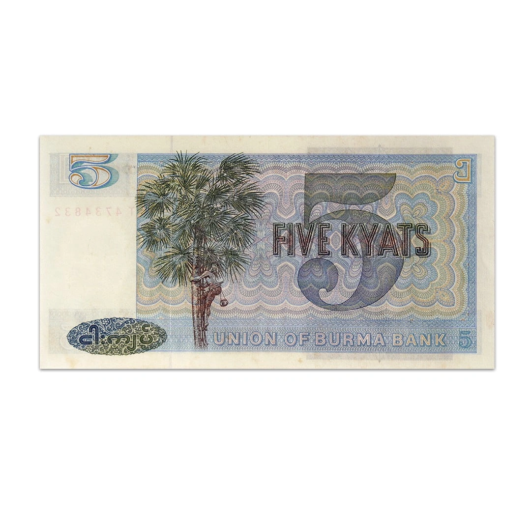 This uncirculated 5 Burmese kyat banknote is a standard circulation banknote introduced by the Union of Burma Bank in 1973. It is a blue, purple, orange, and green banknote that measures 136 mm x 70 mm. Its obverse side shows a portrait of General Aung San in uniform. Its reverse side depicts a man harvesting a coconut. Security features include a solid black security thread and a watermark of FIVE KYATS and General Aung San.