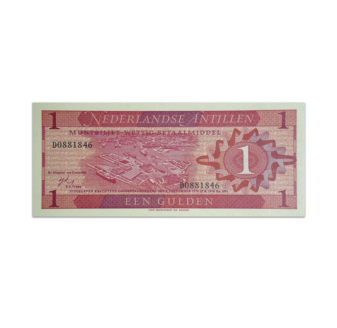 The Netherlands Antilles 1 Gulden banknote is part of the 1970 issues. It measures 155 x 66 mm. The obverse side shows a ship harbor. The reverse side features the coat of arms and guilloche patterns. This banknote has no security thread and watermark.